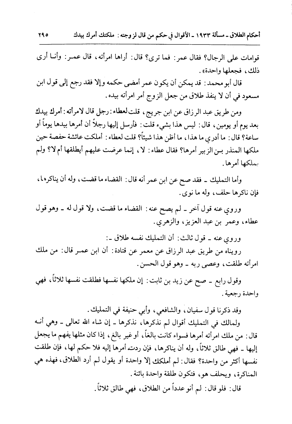 قَالَ أَبُو مُحَمَّدٍ: قَدْ يُمْكِنُ أَنْ يَكُونَ عُمَرُ أَمْضَى حُكْمَهُ وَإِلَّا فَقَدْ رَجَعَ إلَى قَوْلِ ابْنِ مَسْعُودٍ فِي أَنْ لَا يَنْفُذَ طَلَاقُ مَنْ جَعَلَ الزَّوْجُ أَمْرَ امْرَأَتِهِ بِيَدِهِ.