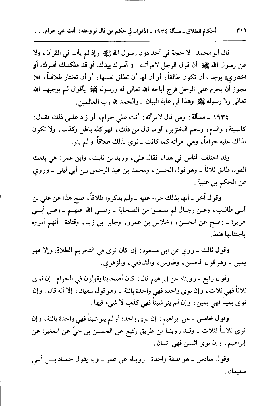 قَالَ أَبُو مُحَمَّدٍ: لَا حُجَّةَ فِي أَحَدٍ دُونَ رَسُولِ اللَّهِ - صَلَّى اللَّهُ عَلَيْهِ وَسَلَّمَ - وَإِذْ لَمْ يَأْتِ فِي الْقُرْآنِ، وَلَا عَنْ رَسُولِ اللَّهِ - صَلَّى اللَّهُ عَلَيْهِ وَسَلَّمَ - أَنَّ قَوْلَ الرَّجُلِ لِامْرَأَتِهِ: " أَمْرُك بِيَدِك، أَوْ قَدْ مَلَّكْتُك أَمْرَك، أَوْ اخْتَارِي " يُوجِبُ أَنْ تَكُونَ طَالِقًا، أَوْ أَنَّ لَهَا أَنْ تُطَلِّقَ نَفْسَهَا، أَوْ أَنْ تَخْتَارَ طَلَاقًا، فَلَا يَجُوزُ أَنْ يَحْرُمَ عَلَى الرَّجُلِ فَرْجٌ أَبَاحَهُ اللَّهُ تَعَالَى لَهُ وَرَسُولُهُ - صَلَّى اللَّهُ عَلَيْهِ وَسَلَّمَ - بِأَقْوَالٍ لَمْ يُوجِبْهَا اللَّهُ تَعَالَى وَلَا رَسُولُهُ - صَلَّى اللَّهُ عَلَيْهِ وَسَلَّمَ - وَهَذَا فِي غَايَةِ الْبَيَانِ - وَالْحَمْدُ لِلَّهِ رَبِّ الْعَالَمِينَ
