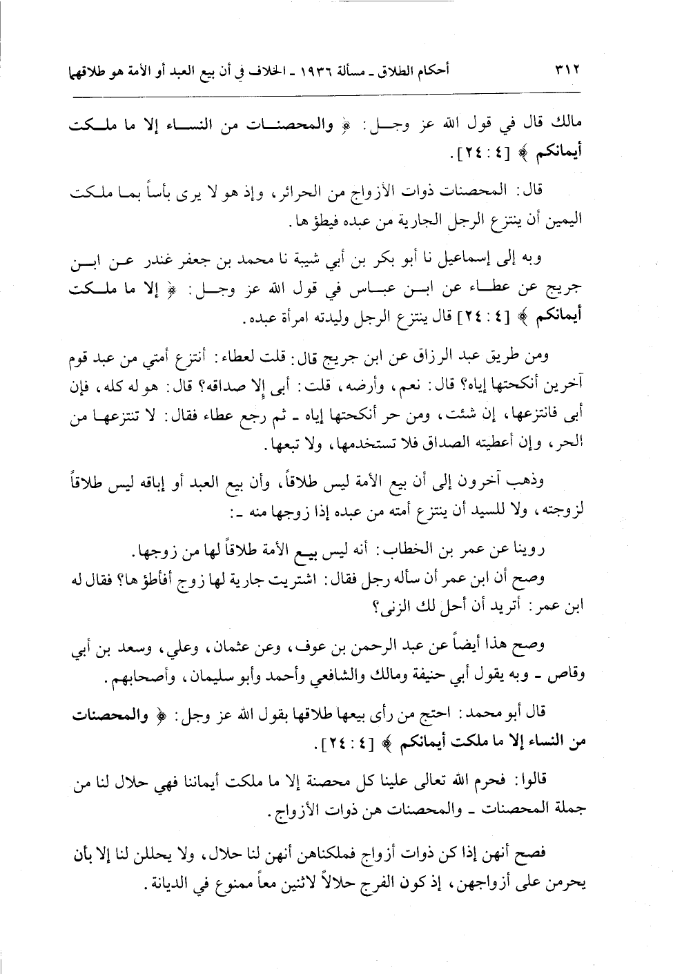 قَالَ أَبُو مُحَمَّدٍ: احْتَجَّ مَنْ رَأَى بَيْعَهَا طَلَاقَهَا بِقَوْلِ اللَّهِ عَزَّ وَجَلَّ: {وَالْمُحْصَنَاتُ مِنَ النِّسَاءِ إِلا مَا مَلَكَتْ أَيْمَانُكُمْ} [النساء: 24] .
