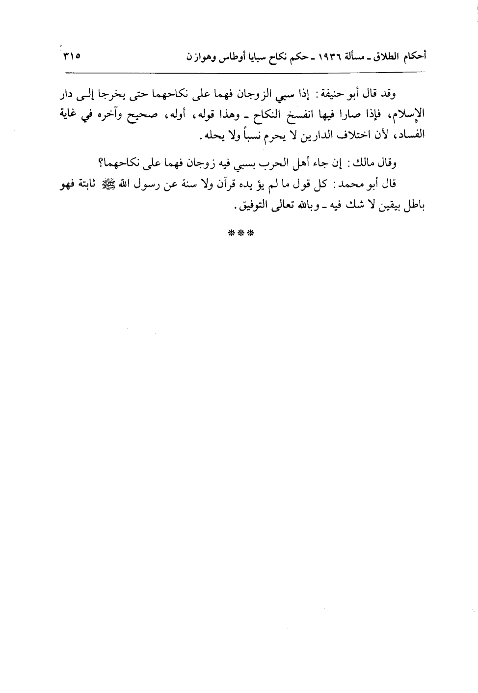 وَقَالَ مَالِكٌ: إنْ جَاءَ أَهْلُ الْحَرْبِ بِسَبْيٍ فِيهِ زَوْجَانِ فَهُمَا عَلَى نِكَاحِهِمَا؟ قَالَ أَبُو مُحَمَّدٍ: كُلُّ قَوْلٍ مَا لَمْ يُؤَيِّدْهُ قُرْآنٌ وَلَا سُنَّةٌ عَنْ رَسُولِ اللَّهِ - صَلَّى اللَّهُ عَلَيْهِ وَسَلَّمَ - ثَابِتَةٌ فَهُوَ بَاطِلٌ بِيَقِينٍ لَا شَكَّ فِيهِ - وَبِاَللَّهِ تَعَالَى التَّوْفِيقُ.