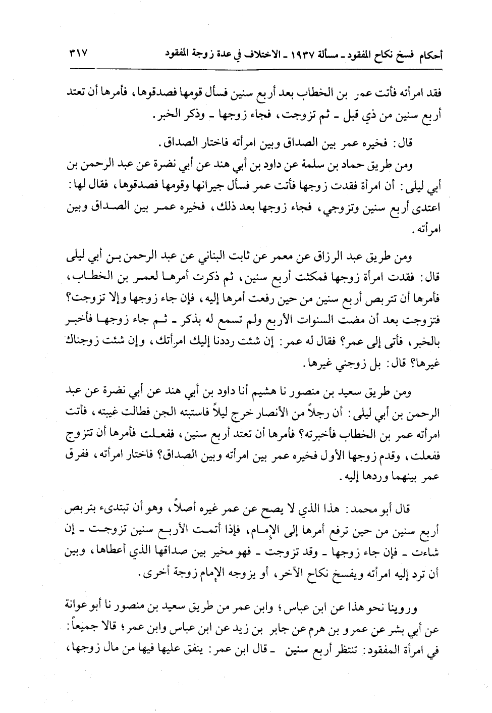 وَمِنْ طَرِيقِ سَعِيدِ بْنِ مَنْصُورٍ نا هُشَيْمٌ نا دَاوُد بْنُ أَبِي هِنْدٍ عَنْ أَبِي نَضْرَةَ عَنْ عَبْدِ الرَّحْمَنِ بْنِ أَبِي لَيْلَى: أَنَّ رَجُلًا مِنْ الْأَنْصَارِ خَرَجَ لَيْلًا فَاسْتَبَتْهُ الْجِنُّ فَطَالَتْ غَيْبَتُهُ، فَأَتَتْ امْرَأَتُهُ عُمَرَ بْنَ الْخَطَّابِ فَأَخْبَرَتْهُ؟ فَأَمَرَهَا أَنْ تَعْتَدَّ أَرْبَعَ سِنِينَ، فَفَعَلَتْ فَأَمَرَهَا أَنْ تَتَزَوَّجَ فَفَعَلَتْ،. وَقَدِمَ زَوْجُهَا الْأَوَّلُ فَخَيَّرَهُ عُمَرُ بَيْنَ امْرَأَتِهِ وَبَيْنَ الصَّدَاقِ؟ فَاخْتَارَ امْرَأَتَهُ، فَفَرَّقَ عُمَرُ بَيْنَهُمَا وَرَدَّهَا إلَيْهِ.