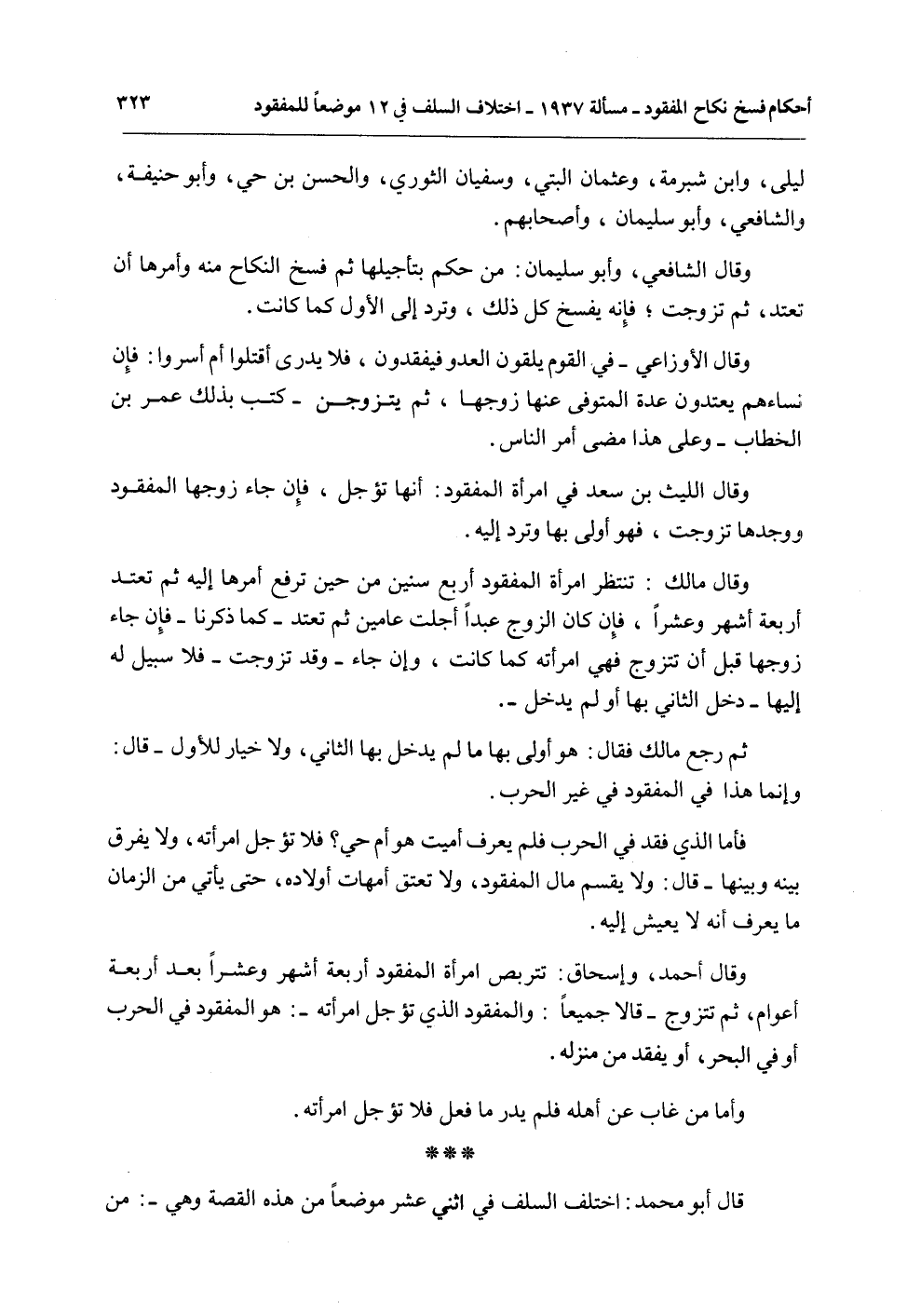 وَقَالَ الْأَوْزَاعِيُّ - فِي الْقَوْمِ يَلْقَوْنَ الْعَدُوَّ فَيُفْقَدُونَ، فَلَا يُدْرَى أَقُتِلُوا أَمْ أُسِرُوا: فَإِنَّ نِسَاءَهُمْ يَعْتَدُّونَ عِدَّةَ الْمُتَوَفَّى عَنْهَا زَوْجُهَا، ثُمَّ يَتَزَوَّجْنَ - كَتَبَ بِذَلِكَ عُمَرُ بْنُ الْخَطَّابِ - وَعَلَى هَذَا مَضَى أَمْرُ النَّاسِ.