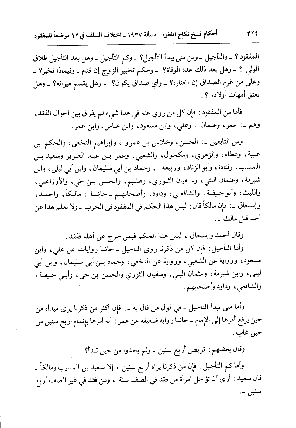 وَمِنْ التَّابِعِينَ -: الْحَسَنُ، وَخِلَاسُ بْنُ عَمْرٍو، وَإِبْرَاهِيمُ النَّخَعِيُّ، وَالْحَكَمُ بْنُ عُتَيْبَةَ، وَعَطَاءٌ، وَالزُّهْرِيُّ، وَمَكْحُولٌ وَالشَّعْبِيُّ، وَعُمَرُ بْنُ عَبْدِ الْعَزِيزِ وَسَعِيدُ بْنُ الْمُسَيِّبِ، وَقَتَادَةُ، وَأَبُو الزِّنَادِ، وَرَبِيعَةُ، وَحَمَّادُ بْنُ أَبِي سُلَيْمَانَ، وَابْنُ أَبِي لَيْلَى، وَابْنُ شُبْرُمَةَ، وَعُثْمَانُ الْبَتِّيُّ، وَسُفْيَانُ الثَّوْرِيُّ، وَهُشَيْمٌ، وَالْحَسَنُ بْنُ حَيٍّ، وَالْأَوْزَاعِيُّ، وَاللَّيْثُ، وَأَبُو حَنِيفَةَ، وَالشَّافِعِيُّ، وَدَاوُد، وَأَصْحَابُهُمْ - حَاشَا: مَالِكًا، وَأَحْمَدَ، وَإِسْحَاقَ -: فَإِنَّ مَالِكًا قَالَ: لَيْسَ هَذَا الْحُكْمُ فِي الْمَفْقُودِ فِي الْحَرْبِ - وَلَا نَعْلَمُ هَذَا عَنْ أَحَدٍ قَبْلَ مَالِكٍ -.