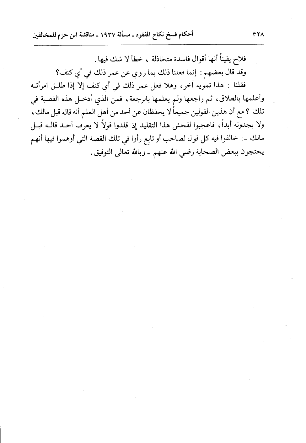 وَقَدْ قَالَ بَعْضُهُمْ: إنَّمَا فَعَلْنَا ذَلِكَ بِمَا رُوِيَ عَنْ عُمَرَ ذَلِكَ فِي أَيِّ كَنَفٍ؟ فَقُلْنَا: هَذَا تَمْوِيهٌ آخَرُ، وَهَلَّا فَعَلَ عُمَرُ ذَلِكَ فِي أَيِّ كَنَفٍ إلَّا إذَا طَلَّقَ امْرَأَتَهُ وَأَعْلَمَهَا بِالطَّلَاقِ، ثُمَّ رَاجَعَهَا وَلَمْ يُعْلِمْهَا بِالرَّجْعَةِ، فَمَنْ الَّذِي أَدْخَلَ هَذِهِ الْقَضِيَّةَ فِي تِلْكَ؟ مَعَ أَنَّ هَذَيْنِ الْقَوْلَيْنِ جَمِيعًا لَا يُحْفَظَانِ عَنْ أَحَدٍ مِنْ أَهْلِ الْعِلْمِ أَنَّهُ قَالَهُ قَبْلَ مَالِكٍ، وَلَا يَجِدُونَهُ أَبَدًا، فَاعْجَبُوا لِفُحْشِ هَذَا التَّقْلِيدِ إذْ قَلَّدُوا قَوْلًا لَا يُعْرَفُ أَحَدٌ قَالَهُ قَبْلَ مَالِكٍ -: خَالَفُوا فِيهِ كُلَّ قَوْلٍ لِصَاحِبٍ أَوْ تَابِعٍ رَأَوْا فِي تِلْكَ الْقِصَّةِ الَّتِي أَوْهَمُوا فِيهَا أَنَّهُمْ يَحْتَجُّونَ بِبَعْضِ الصَّحَابَةِ - رَضِيَ اللَّهُ عَنْهُمْ - وَبِاَللَّهِ تَعَالَى التَّوْفِيقُ.