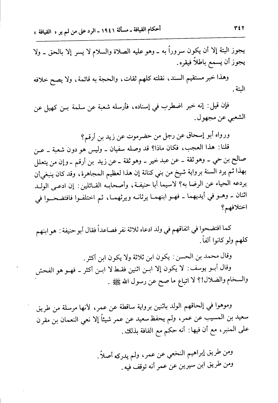 وَرَوَاهُ أَبُو إِسْحَاقَ عَنْ رَجُلٍ مِنْ حَضْرَمَوْتَ عَنْ زَيْدِ بْنِ أَرْقَمَ؟ قُلْنَا: هَذَا الْعَجَبُ، فَكَانَ مَاذَا؟ قَدْ وَصَلَهُ سُفْيَانُ - وَلَيْسَ هُوَ دُونَ شُعْبَةَ - عَنْ صَالِحِ بْنِ حَيٍّ - وَهُوَ ثِقَةٌ - عَنْ عَبْدِ خَيْرٍ - وَهُوَ ثِقَةٌ - عَنْ زَيْدِ بْنِ أَرْقَمَ - وَإِنَّ مَنْ يَتَعَلَّلُ بِهَذَا ثُمَّ يَرُدُّ السُّنَّةَ بِرِوَايَةِ شَيْخٍ مِنْ بَنِي كِنَانَةَ إنَّ هَذَا لَعَظِيمُ الْمُجَاهَرَةِ، وَقَدْ كَانَ يَنْبَغِي أَنْ يَرْدَعَهُ الْحَيَاءُ عَنْ الرِّضَا بِهِ؟ لَا سِيَّمَا أَبَا حَنِيفَةَ، وَأَصْحَابَهُ الْقَائِلِينَ: إنْ ادَّعَى الْوَلَدَ اثْنَانِ - وَهُوَ فِي أَيْدِيهِمَا - فَهُوَ ابْنُهُمَا يَرِثَانِهِ وَيَرِثُهُمَا، ثُمَّ اخْتَلَفُوا فَافْتَضَحُوا فِي اخْتِلَافِهِمْ؟ كَمَا افْتَضَحُوا فِي اتِّفَاقِهِمْ فِي وَلَدٍ ادَّعَاهُ ثَلَاثَةُ نَفَرٍ فَصَاعِدًا فَقَالَ أَبُو حَنِيفَةَ: هُوَ ابْنُهُمْ كُلُّهُمْ وَلَوْ كَانُوا أَلْفًا.