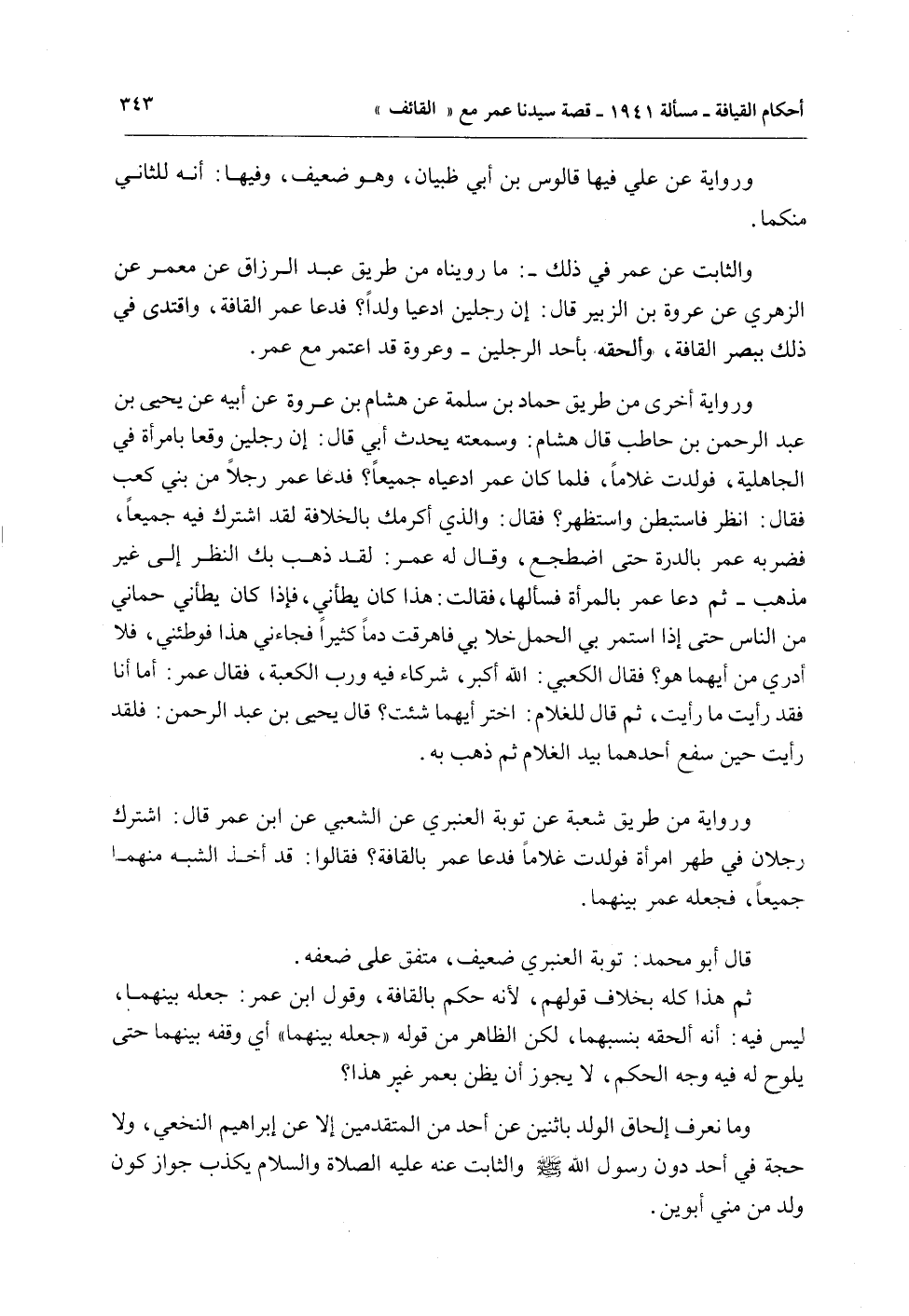 وَالثَّابِتُ عَنْ عُمَرَ فِي ذَلِكَ -: مَا رُوِّينَاهُ مِنْ طَرِيقِ عَبْدِ الرَّزَّاقِ عَنْ مَعْمَرٍ عَنْ الزُّهْرِيِّ عَنْ عُرْوَةَ بْنِ الزُّبَيْرِ قَالَ: إنَّ رَجُلَيْنِ ادَّعَيَا وَلَدًا؟ فَدَعَا عُمَرُ الْقَافَةَ، وَاقْتَدَى فِي ذَلِكَ بِبَصَرِ الْقَافَةِ، وَأَلْحَقَهُ بِأَحَدِ الرَّجُلَيْنِ - وَعُرْوَةُ قَدْ اعْتَمَرَ مَعَ عُمَرَ.