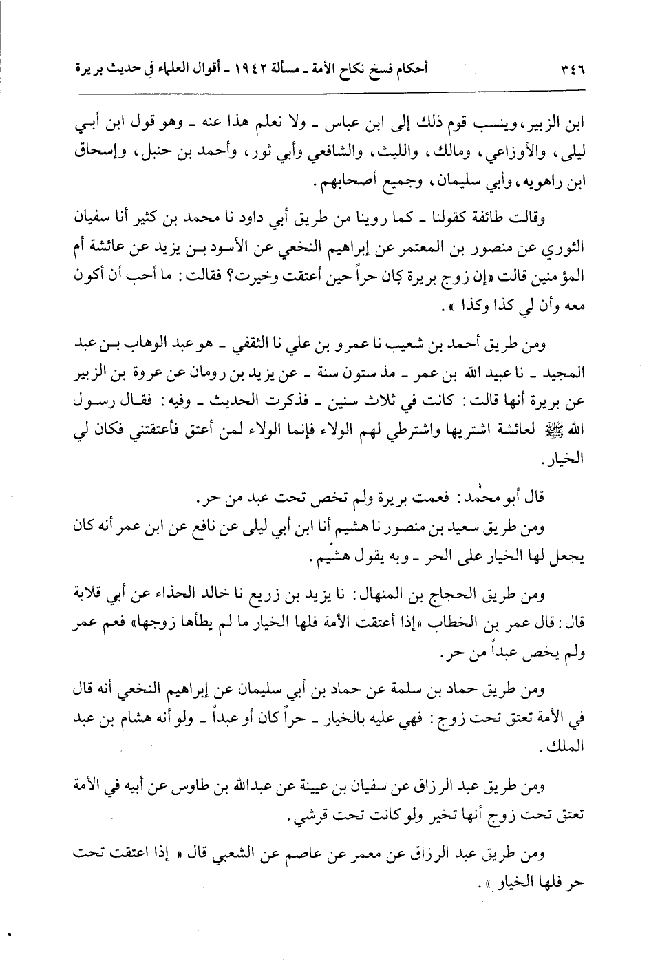 وَقَالَتْ طَائِفَةٌ كَقَوْلِنَا - كَمَا رُوِّينَا مِنْ طَرِيقِ أَبِي دَاوُد نا مُحَمَّدُ بْنُ كَثِيرٍ نا سُفْيَانُ الثَّوْرِيُّ عَنْ مَنْصُورِ بْنِ الْمُعْتَمِرِ عَنْ إبْرَاهِيمَ النَّخَعِيِّ عَنْ الْأَسْوَدِ بْنِ يَزِيدَ عَنْ عَائِشَةَ أُمِّ الْمُؤْمِنِينَ قَالَتْ " إنَّ زَوْجَ بَرِيرَةَ كَانَ حُرًّا حِينَ أُعْتِقَتْ وَخُيِّرَتْ؟ فَقَالَتْ: مَا أُحِبُّ أَنْ أَكُونَ مَعَهُ وَأَنَّ لِي كَذَا وَكَذَا ".