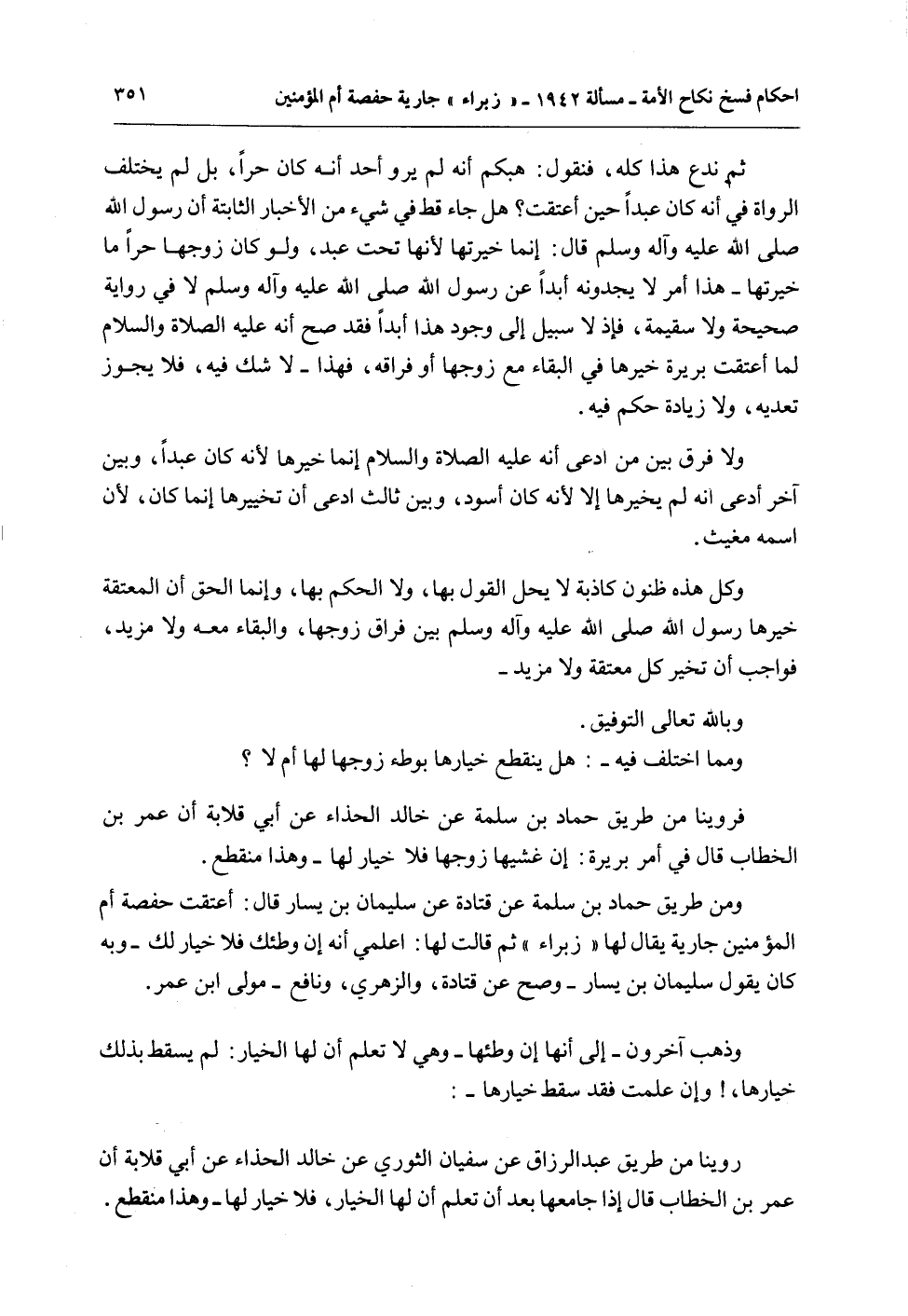 وَمِنْ طَرِيقِ حَمَّادِ بْنِ سَلَمَةَ عَنْ قَتَادَةَ عَنْ سُلَيْمَانَ بْنِ يَسَارٍ قَالَ: أَعْتَقَتْ حَفْصَةُ أُمُّ الْمُؤْمِنِينَ جَارِيَةً يُقَالُ لَهَا " زَبْرَاءُ " ثُمَّ قَالَتْ لَهَا: اعْلَمِي أَنَّهُ إنْ وَطِئَك فَلَا خِيَارَ لَك - وَبِهِ كَانَ يَقُولُ سُلَيْمَانُ بْنُ يَسَارٍ - وَصَحَّ عَنْ قَتَادَةَ، وَالزُّهْرِيِّ، وَنَافِعٍ مَوْلَى ابْنِ عُمَرَ.