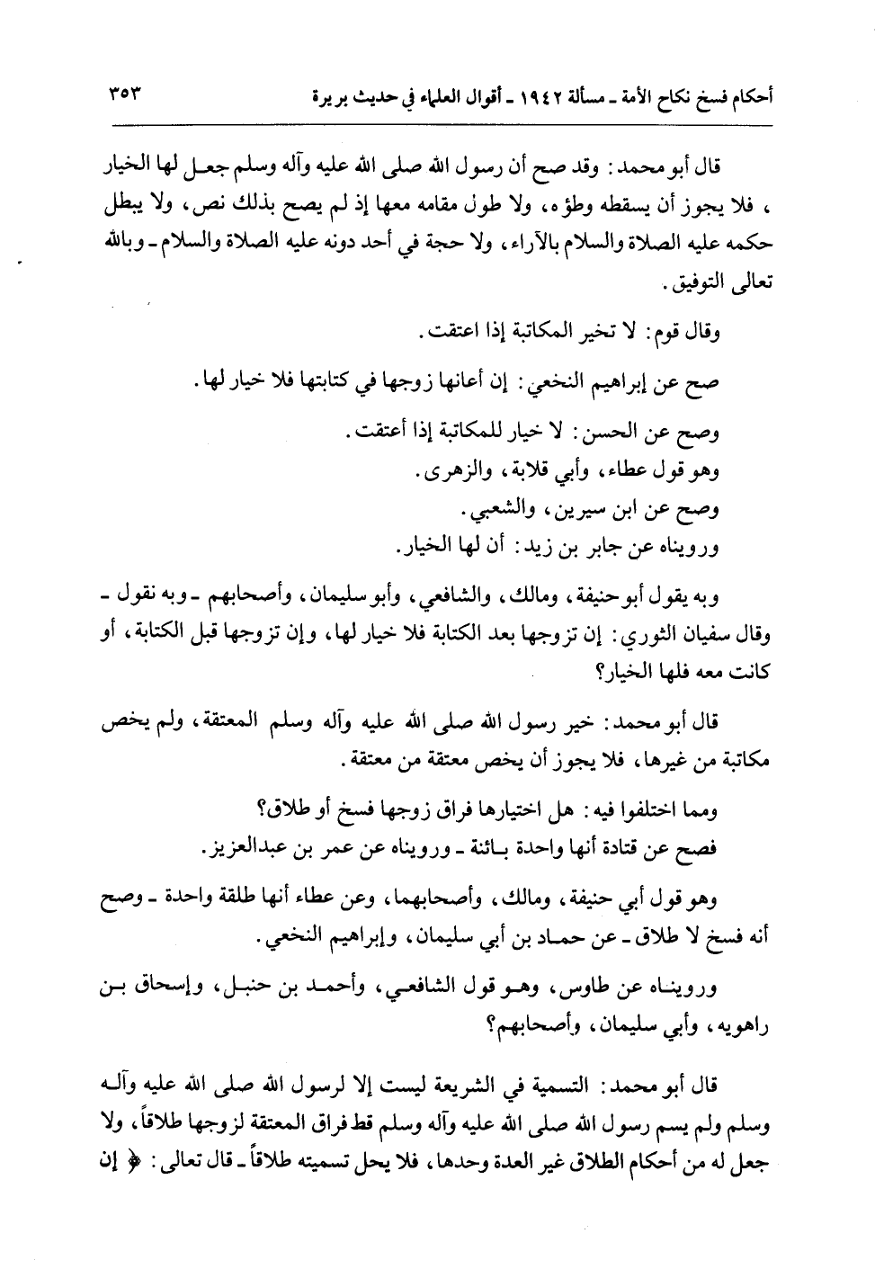 وَرُوِّينَاهُ عَنْ طَاوُسٍ، وَهُوَ قَوْلُ الشَّافِعِيِّ، وَأَحْمَدَ بْنِ حَنْبَلٍ، وَإِسْحَاقَ بْنِ رَاهْوَيْهِ، وَأَبِي سُلَيْمَانَ، وَأَصْحَابِهِمْ؟ قَالَ أَبُو مُحَمَّدٍ: التَّسْمِيَةُ فِي الشَّرِيعَةِ لَيْسَتْ إلَّا لِرَسُولِ اللَّهِ - صَلَّى اللَّهُ عَلَيْهِ وَآلِهِ وَسَلَّمَ - وَلَمْ يُسَمِّ رَسُولُ اللَّهِ - صَلَّى اللَّهُ عَلَيْهِ وَآلِهِ وَسَلَّمَ - قَطُّ فِرَاقَ الْمُعْتَقَةِ لِزَوْجِهَا طَلَاقًا، وَلَا جَعَلَ لَهُ مِنْ أَحْكَامِ الطَّلَاقِ غَيْرَ الْعِدَّةِ وَحْدَهَا، فَلَا يَحِلُّ تَسْمِيَتُهُ طَلَاقًا - قَالَ تَعَالَى: