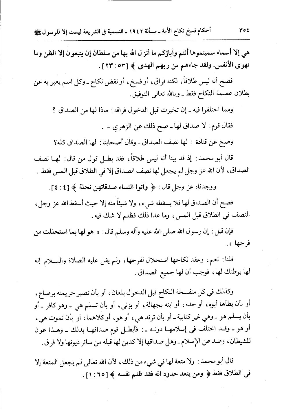 وَصَحَّ عَنْ قَتَادَةَ: لَهَا نِصْفُ الصَّدَاقِ - وَقَالَ أَصْحَابُنَا: لَهَا الصَّدَاقُ كُلُّهُ؟ قَالَ أَبُو مُحَمَّدٍ: إذْ قَدْ بَيَّنَّا أَنَّهُ لَيْسَ طَلَاقًا، فَقَدْ بَطَلَ قَوْلُ مَنْ قَالَ: لَهَا نِصْفُ الصَّدَاقِ، لِأَنَّ اللَّهَ عَزَّ وَجَلَّ لَمْ يَجْعَلْ لَهَا نِصْفَ الصَّدَاقِ إلَّا فِي الطَّلَاقِ قَبْلَ الْمَسِّ فَقَطْ.
