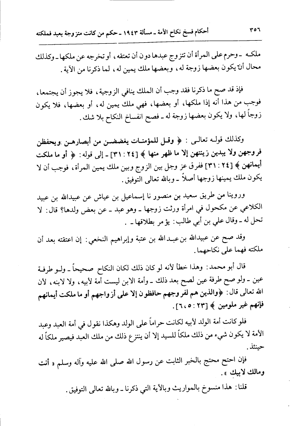 وَكَذَلِكَ قَوْله تَعَالَى: {وَقُلْ لِلْمُؤْمِنَاتِ يَغْضُضْنَ مِنْ أَبْصَارِهِنَّ وَيَحْفَظْنَ فُرُوجَهُنَّ وَلا يُبْدِينَ زِينَتَهُنَّ إِلا مَا ظَهَرَ مِنْهَا} [النور: 31] إلَى قَوْلِهِ: {أَوْ مَا مَلَكَتْ أَيْمَانُهُنَّ} [النور: 31] فَفَرَّقَ عَزَّ وَجَلَّ بَيْنَ الزَّوْجِ وَبَيْنَ مِلْكِ يَمِينِ الْمَرْأَةِ، فَوَجَبَ أَنْ لَا يَكُونَ مِلْكُ يَمِينِهَا زَوْجَهَا أَصْلًا - وَبِاَللَّهِ تَعَالَى التَّوْفِيقُ.