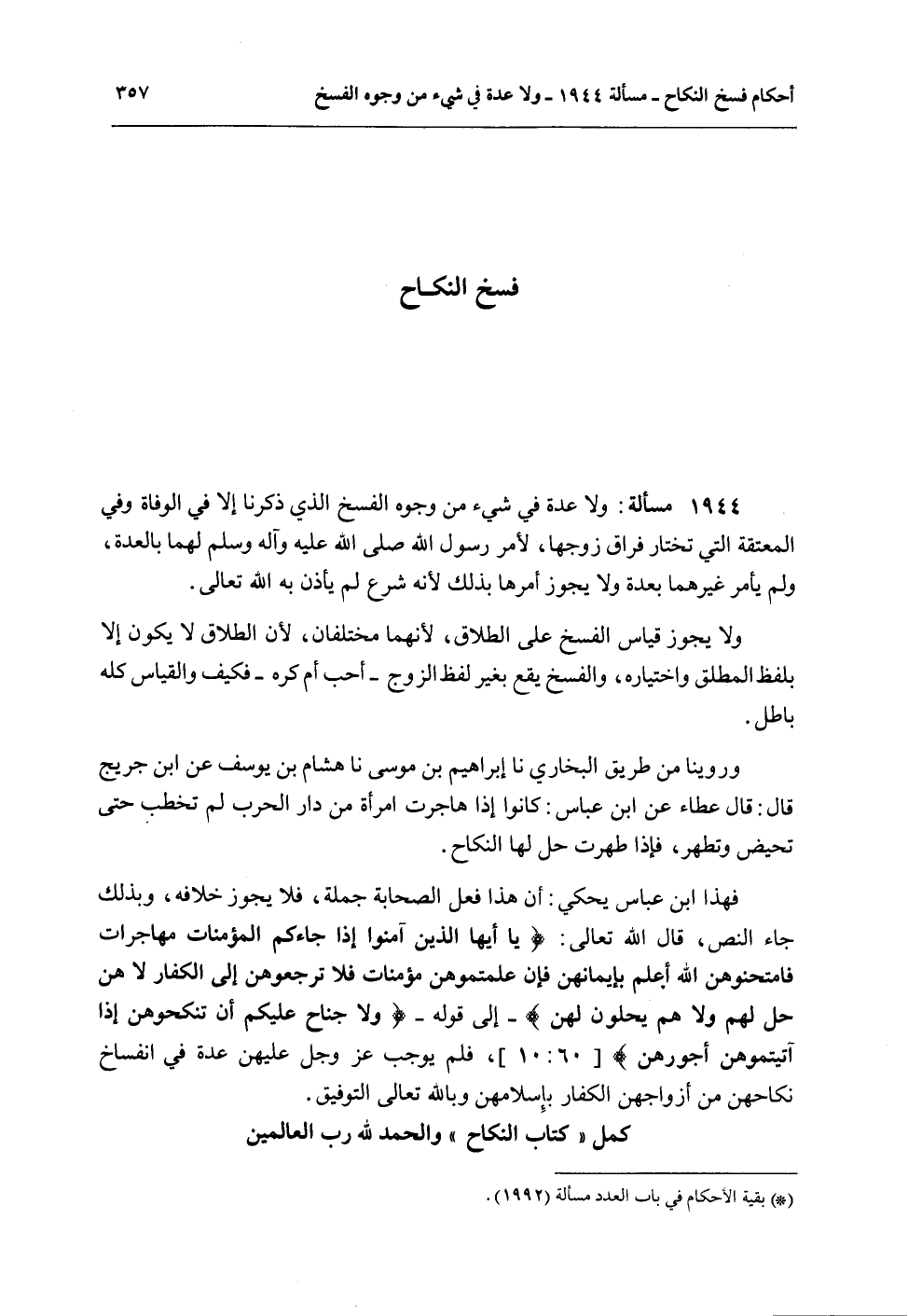 فَسْخُ النِّكَاحِ 1944 - مَسْأَلَةٌ: وَلَا عِدَّةَ فِي شَيْءٍ مِنْ وُجُوهِ الْفَسْخِ الَّذِي ذَكَرْنَا إلَّا فِي الْوَفَاةِ وَفِي الْمُعْتَقَةِ الَّتِي تَخْتَارُ فِرَاقَ زَوْجِهَا، لِأَمْرِ رَسُولِ اللَّهِ - صَلَّى اللَّهُ عَلَيْهِ وَآلِهِ وَسَلَّمَ - لَهُمَا بِالْعِدَّةِ، وَلَمْ يَأْمُرْ غَيْرَهُمَا بِعِدَّةٍ وَلَا يَجُوزُ أَمْرُهَا بِذَلِكَ؛ لِأَنَّهُ شَرْعٌ لَمْ يَأْذَنْ بِهِ اللَّهُ تَعَالَى.