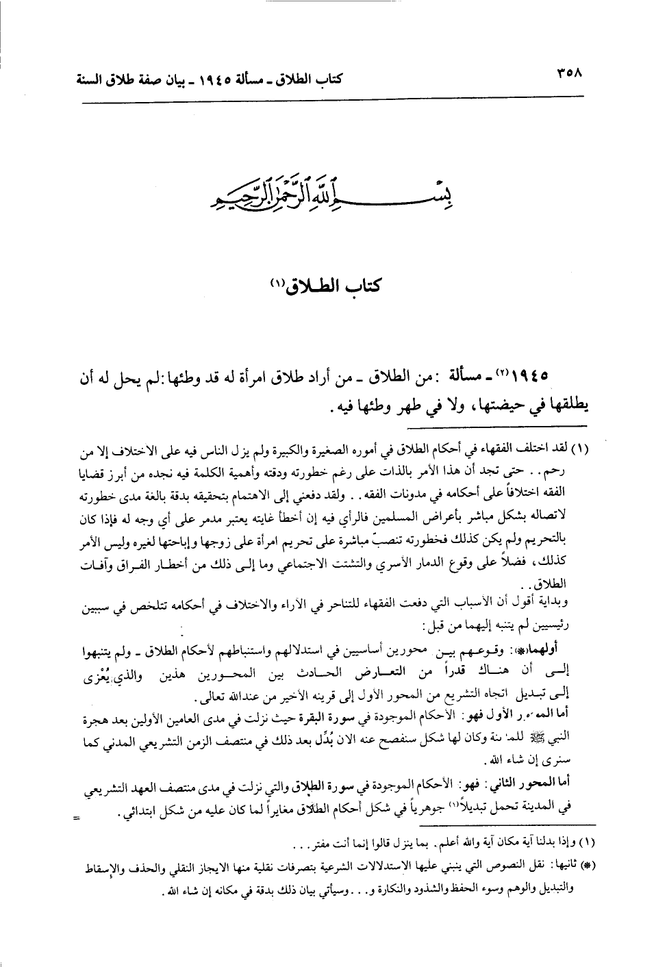 بِسْمِ اللَّهِ الرَّحْمَنِ الرَّحِيمِ كِتَابُ الطَّلَاقِ 1945 - مَسْأَلَةٌ: مِنْ الطَّلَاقِ - مَنْ أَرَادَ طَلَاقَ امْرَأَةٍ لَهُ قَدْ وَطِئَهَا: لَمْ يَحِلَّ لَهُ أَنْ يُطَلِّقَهَا فِي حَيْضَتِهَا، وَلَا فِي طُهْرٍ وَطِئَهَا فِيهِ.