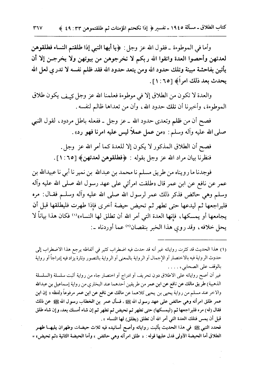 فَوَجَدْنَا مَا رُوِّينَاهُ مِنْ طَرِيقِ مُسْلِمٍ نا مُحَمَّدُ بْنُ عَبْدِ اللَّهِ بْنِ نُمَيْرٍ نا أَبِي نا عُبَيْدُ اللَّهِ بْنُ عُمَرَ عَنْ نَافِعٍ عَنْ ابْنِ عُمَرَ قَالَ " طَلَّقْت امْرَأَتِي عَلَى عَهْدِ رَسُولِ اللَّهِ - صَلَّى اللَّهُ عَلَيْهِ وَآلِهِ وَسَلَّمَ - وَهِيَ حَائِضٌ فَذَكَرَ ذَلِكَ عُمَرُ لِرَسُولِ اللَّهِ - صَلَّى اللَّهُ عَلَيْهِ وَآلِهِ وَسَلَّمَ - فَقَالَ: «مُرْهُ فَلْيُرَاجِعْهَا ثُمَّ لِيَدَعْهَا حَتَّى تَطْهُرَ ثُمَّ تَحِيضَ حَيْضَةً أُخْرَى فَإِذَا طَهُرَتْ فَلْيُطَلِّقْهَا قَبْلَ أَنْ يُجَامِعَهَا أَوْ يُمْسِكَهَا، فَإِنَّهَا الْعِدَّةُ الَّتِي أَمَرَ اللَّهُ أَنْ تَطْلُقَ لَهَا النِّسَاءُ» فَكَانَ هَذَا بَيَانًا لَا يَحِلُّ خِلَافُهُ، وَقَدْ رُوِيَ هَذَا الْخَبَرُ بِنُقْصَانٍ عَمَّا أَوْرَدْنَاهُ -: