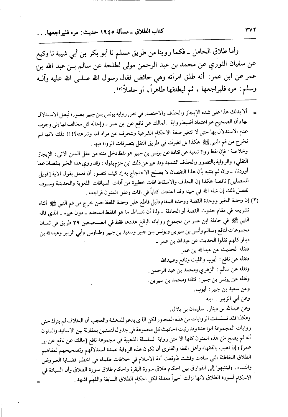 وَأَمَّا طَلَاقُ الْحَامِلِ - فَكَمَا رُوِّينَا مِنْ طَرِيقِ مُسْلِمٍ أَنَا أَبُو بَكْرِ بْنُ أَبِي شَيْبَةَ نا وَكِيعٌ عَنْ سُفْيَانَ الثَّوْرِيِّ عَنْ مُحَمَّدِ بْنِ عَبْدِ الرَّحْمَنِ مَوْلًى لِطَلْحَةَ عَنْ سَالِمِ بْنِ عَبْدِ اللَّهِ بْنِ عُمَرَ عَنْ ابْنِ عُمَرَ: أَنَّهُ طَلَّقَ امْرَأَتَهُ وَهِيَ حَائِضٌ فَقَالَ رَسُولُ اللَّهِ - صَلَّى اللَّهُ عَلَيْهِ وَآلِهِ وَسَلَّمَ -: «مُرْهُ فَلْيُرَاجِعْهَا، ثُمَّ لِيُطَلِّقْهَا طَاهِرًا، أَوْ حَامِلًا» .