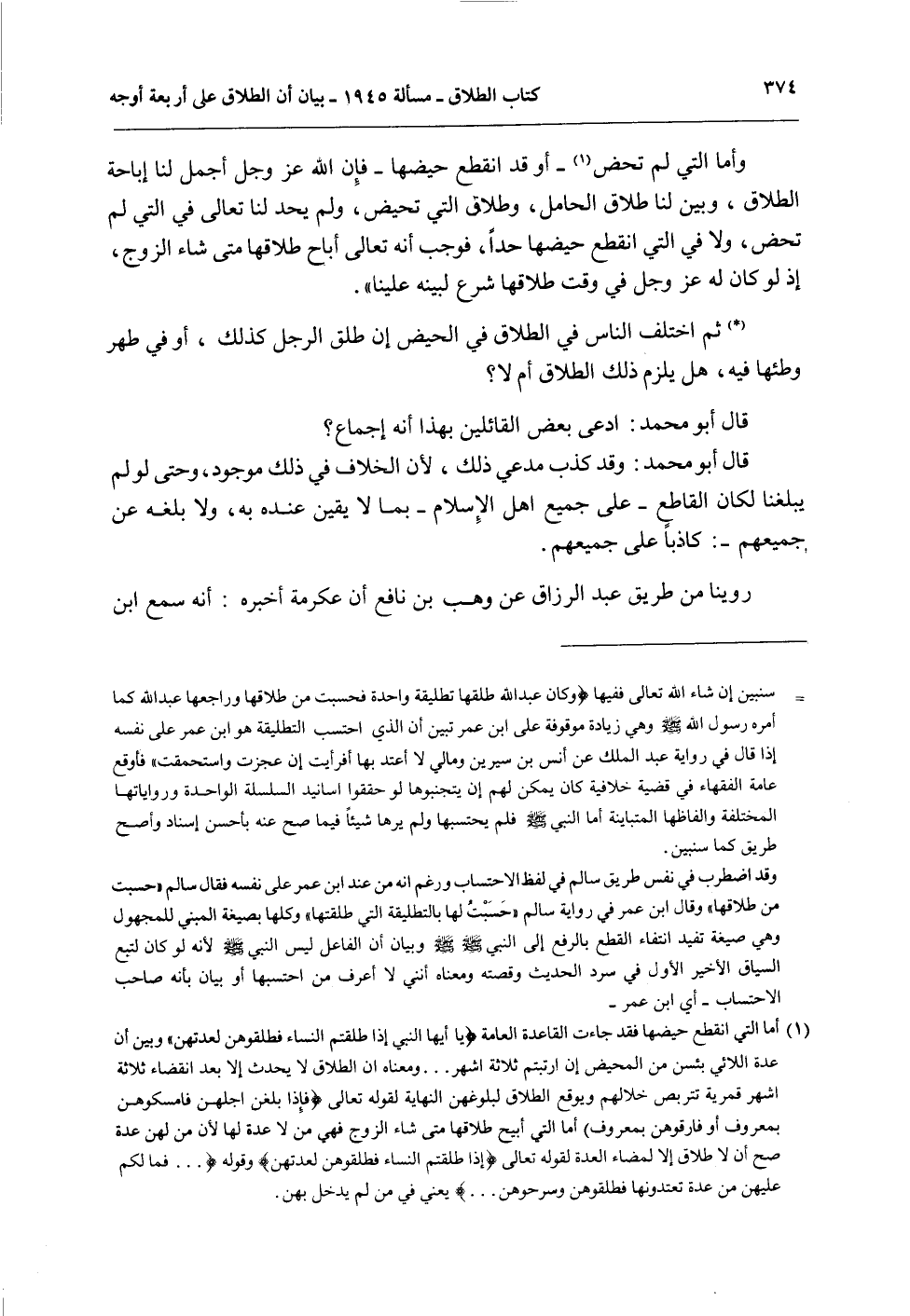 وَأَمَّا الَّتِي لَمْ تَحِضْ - أَوْ قَدْ انْقَطَعَ حَيْضُهَا - فَإِنَّ اللَّهَ عَزَّ وَجَلَّ أَجْمَلَ لَنَا إبَاحَةَ الطَّلَاقِ، وَبَيَّنَ لَنَا طَلَاقَ الْحَامِلِ، وَطَلَاقَ الَّتِي تَحِيضُ، وَلَمْ يَحُدَّ لَنَا تَعَالَى فِي الَّتِي لَمْ تَحِضْ، وَلَا فِي الَّتِي انْقَطَعَ حَيْضُهَا حَدًّا، فَوَجَبَ أَنَّهُ تَعَالَى أَبَاحَ طَلَاقَهَا مَتَى شَاءَ الزَّوْجُ، إذْ لَوْ كَانَ لَهُ عَزَّ وَجَلَّ فِي وَقْتِ طَلَاقِهَا شَرْعٌ لَبَيَّنَهُ عَلَيْنَا ".
