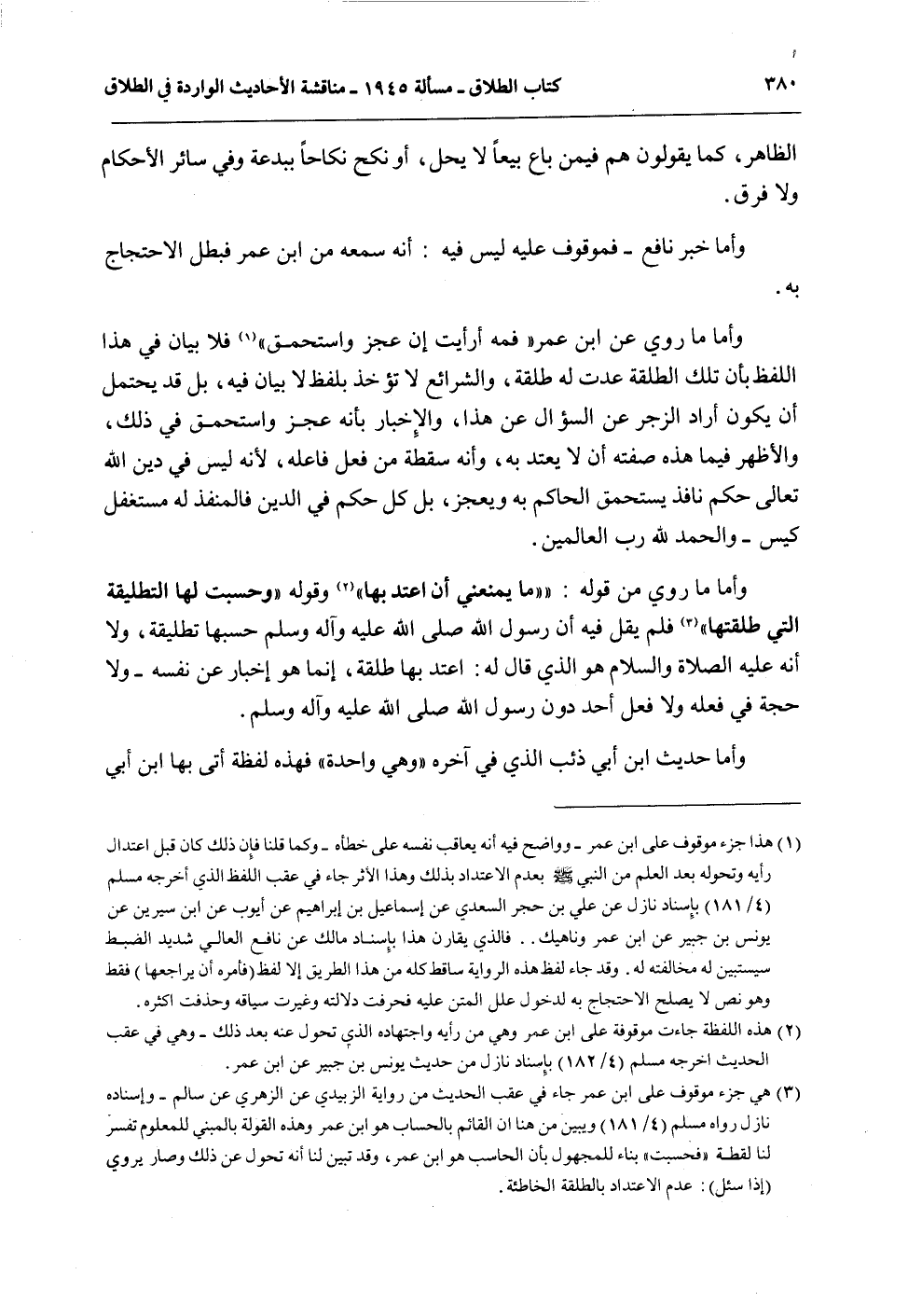 وَأَمَّا مَا رُوِيَ عَنْ ابْنِ عُمَرَ " فَمَهْ أَرَأَيْت إنْ عَجَزَ وَاسْتَحْمَقَ " فَلَا بَيَانَ فِي هَذَا اللَّفْظِ بِأَنَّ تِلْكَ الطَّلْقَةَ عُدَّتْ لَهُ طَلْقَةٌ، وَالشَّرَائِعُ لَا تُؤْخَذُ بِلَفْظٍ لَا بَيَانَ فِيهِ، بَلْ قَدْ يُحْتَمَلُ أَنْ يَكُونَ أَرَادَ الزَّجْرَ عَنْ السُّؤَالِ عَنْ هَذَا، وَالْإِخْبَارَ بِأَنَّهُ عَجَزَ وَاسْتَحْمَقَ فِي ذَلِكَ، وَالْأَظْهَرُ فِيمَا هَذِهِ صِفَتُهُ أَنْ لَا يُعْتَدَّ بِهِ، وَأَنَّهُ سَقْطَةٌ مِنْ فِعْلِ فَاعِلِهِ، لِأَنَّهُ لَيْسَ فِي دِينِ اللَّهِ تَعَالَى حُكْمٌ نَافِذٌ يَسْتَحْمِقُ الْحَاكِمُ بِهِ وَيَعْجِزُ، بَلْ كُلُّ حُكْمٍ فِي الدِّينِ فَالْمُنَفِّذُ لَهُ مُسْتَغْفِلٌ كَيِّسٌ - وَالْحَمْدُ لِلَّهِ رَبِّ الْعَالَمِينَ.