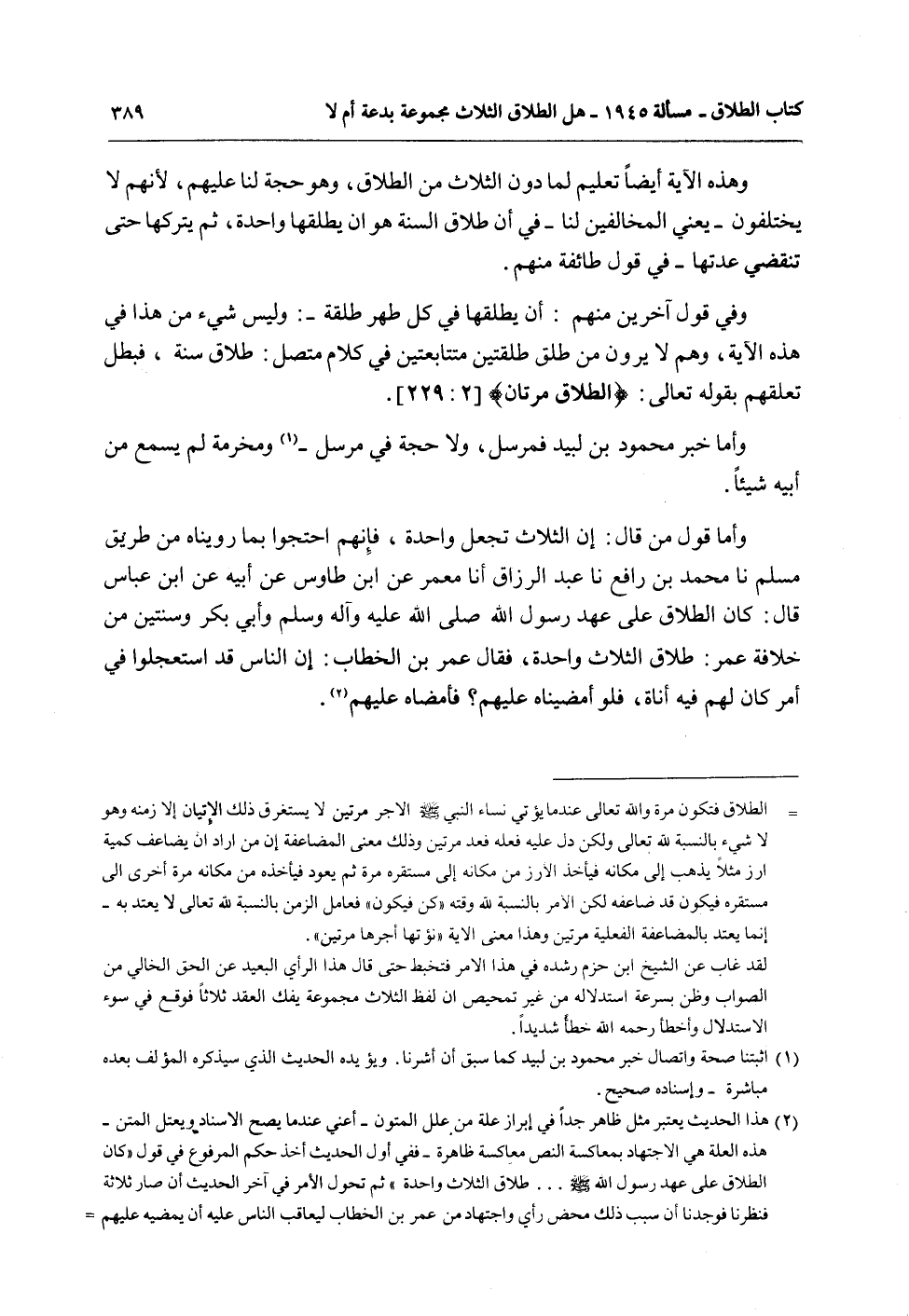 وَأَمَّا قَوْلُ مَنْ قَالَ: إنَّ الثَّلَاثَ تُجْعَلُ وَاحِدَةً، فَإِنَّهُمْ احْتَجُّوا بِمَا رُوِّينَاهُ مِنْ طَرِيقِ مُسْلِمٍ نا مُحَمَّدُ بْنُ رَافِعٍ نا عَبْدُ الرَّزَّاقِ نا مَعْمَرٌ عَنْ ابْنِ طَاوُسٍ عَنْ أَبِيهِ عَنْ ابْنِ عَبَّاسٍ قَالَ: كَانَ الطَّلَاقُ عَلَى عَهْدِ رَسُولِ اللَّهِ - صَلَّى اللَّهُ عَلَيْهِ وَآلِهِ وَسَلَّمَ - وَأَبِي بَكْرٍ وَسَنَتَيْنِ مِنْ خِلَافَةِ عُمَرَ: طَلَاقُ الثَّلَاثِ وَاحِدَةً، فَقَالَ عُمَرُ بْنُ الْخَطَّابِ: إنَّ النَّاسَ قَدْ اسْتَعْجَلُوا فِي أَمْرٍ كَانَ لَهُمْ فِيهِ أَنَاةٌ، فَلَوْ أَمْضَيْنَاهُ عَلَيْهِمْ؟ فَأَمْضَاهُ عَلَيْهِمْ.