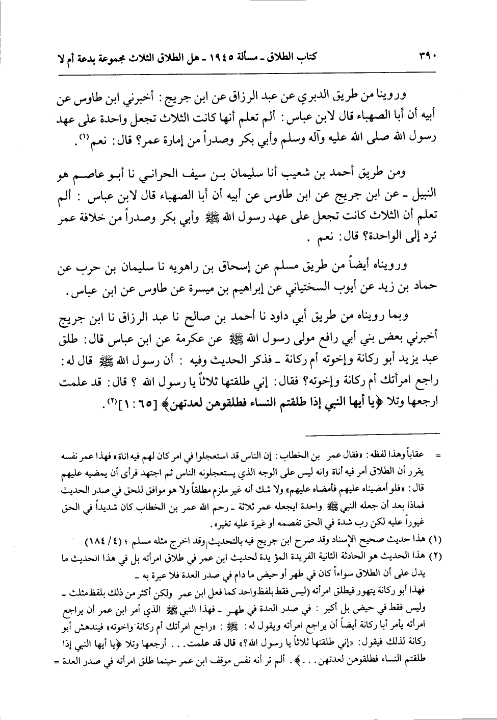 وَرُوِّينَا مِنْ طَرِيقِ الدَّبَرِيِّ عَنْ عَبْدِ الرَّزَّاقِ عَنْ ابْنِ جُرَيْجٍ: أَخْبَرَنِي ابْنُ طَاوُسٍ عَنْ أَبِيهِ أَنَّ أَبَا الصَّهْبَاءِ قَالَ لِابْنِ عَبَّاسٍ: أَلَمْ تَعْلَمْ أَنَّهَا كَانَتْ الثَّلَاثُ تُجْعَلُ وَاحِدَةً عَلَى عَهْدِ رَسُولِ اللَّهِ - صَلَّى اللَّهُ عَلَيْهِ وَآلِهِ وَسَلَّمَ - وَأَبِي بَكْرٍ وَصَدْرًا مِنْ إمَارَةِ عُمَرَ؟ قَالَ: نَعَمْ.