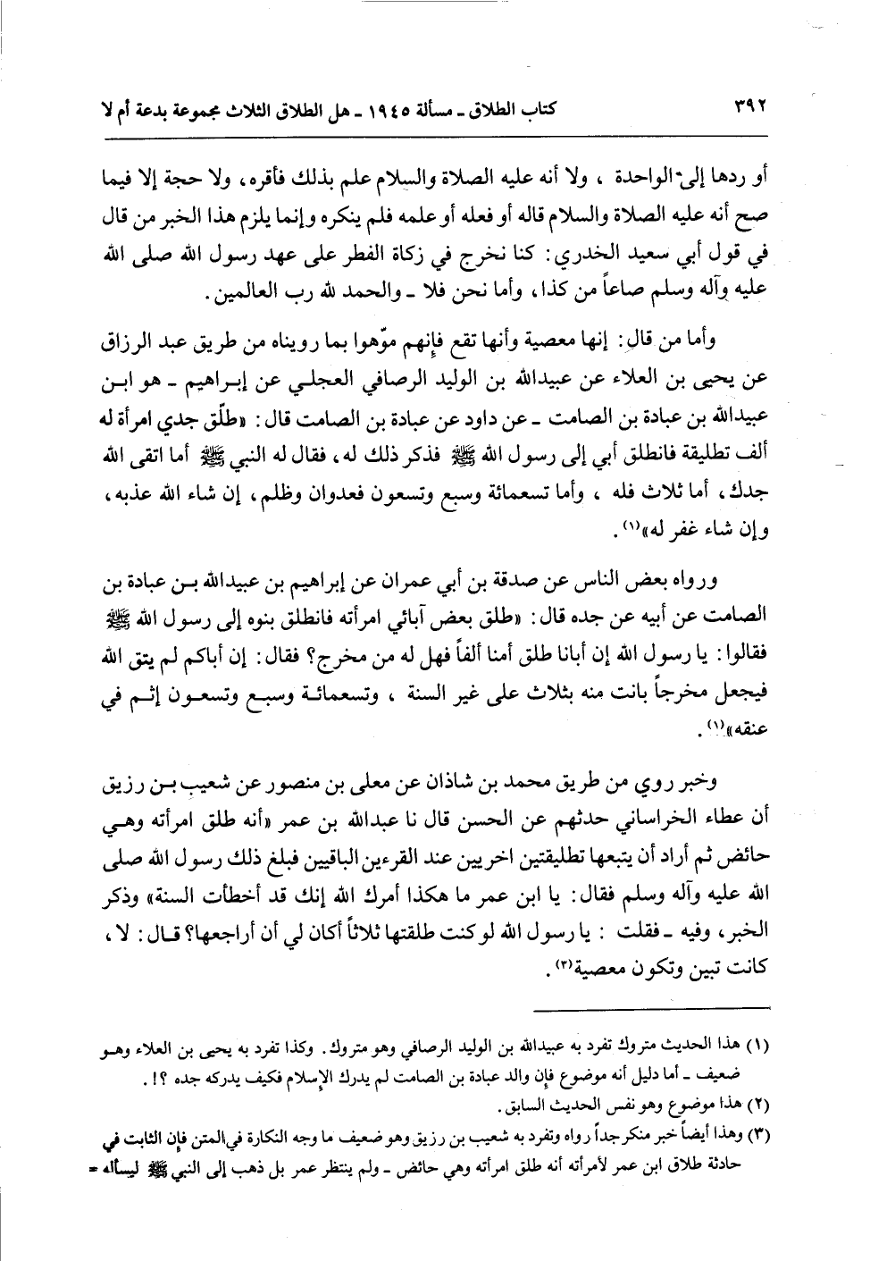 وَأَمَّا مَنْ قَالَ: إنَّهَا مَعْصِيَةٌ وَأَنَّهَا تَقَعُ فَإِنَّهُمْ مَوَّهُوا بِمَا رُوِّينَاهُ مِنْ طَرِيقِ عَبْدِ الرَّزَّاقِ عَنْ يَحْيَى بْنِ الْعَلَاءِ عَنْ عُبَيْدِ اللَّهِ بْنِ الْوَلِيدِ الرُّصَافِيِّ الْعِجْلِيّ عَنْ إبْرَاهِيمَ - هُوَ ابْنُ عُبَيْدِ اللَّهِ بْنُ عُبَادَةَ بْنِ الصَّامِتِ - عَنْ دَاوُد عَنْ عُبَادَةَ بْنِ الصَّامِتِ قَالَ: «طَلَّقَ جَدِّي امْرَأَةً لَهُ أَلْفَ تَطْلِيقَةٍ فَانْطَلَقَ أَبِي إلَى رَسُولِ اللَّهِ - صَلَّى اللَّهُ عَلَيْهِ وَسَلَّمَ - فَذَكَرَ ذَلِكَ لَهُ، فَقَالَ لَهُ النَّبِيُّ - صَلَّى اللَّهُ عَلَيْهِ وَسَلَّمَ - أَمَا اتَّقَى اللَّهَ جَدُّكَ، أَمَّا ثَلَاثٌ فَلَهُ، وَأَمَّا تِسْعُمِائَةٍ وَسَبْعٌ وَتِسْعُونَ فَعُدْوَانٌ وَظُلْمٌ، إنْ شَاءَ اللَّهُ عَذَّبَهُ، وَإِنْ شَاءَ غَفَرَ لَهُ» .