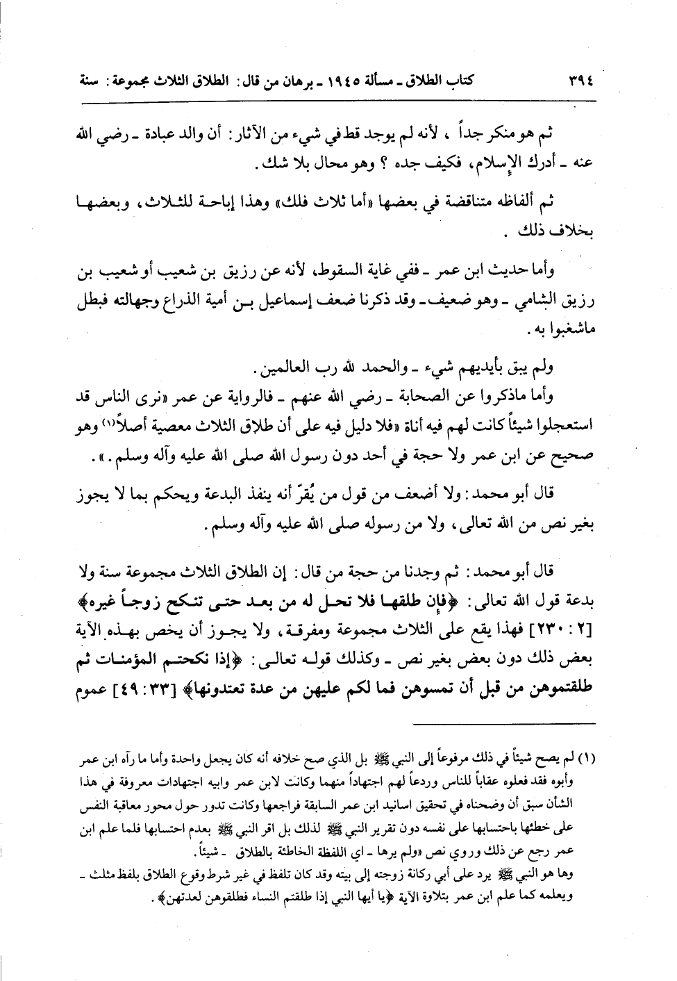 وَأَمَّا مَا ذَكَرُوا عَنْ الصَّحَابَةِ - رَضِيَ اللَّهُ عَنْهُمْ - فَالرِّوَايَةُ عَنْ عُمَرَ " نَرَى النَّاسَ قَدْ اسْتَعْجَلُوا شَيْئًا كَانَتْ لَهُمْ فِيهِ أَنَاةٌ " فَلَا دَلِيلَ فِيهِ عَلَى أَنَّ طَلَاقَ الثَّلَاثِ مَعْصِيَةٌ أَصْلًا وَهُوَ صَحِيحٌ عَنْ ابْنِ عُمَرَ وَلَا حُجَّةَ فِي أَحَدٍ دُونَ رَسُولِ اللَّهِ - صَلَّى اللَّهُ عَلَيْهِ وَآلِهِ وَسَلَّمَ - ".