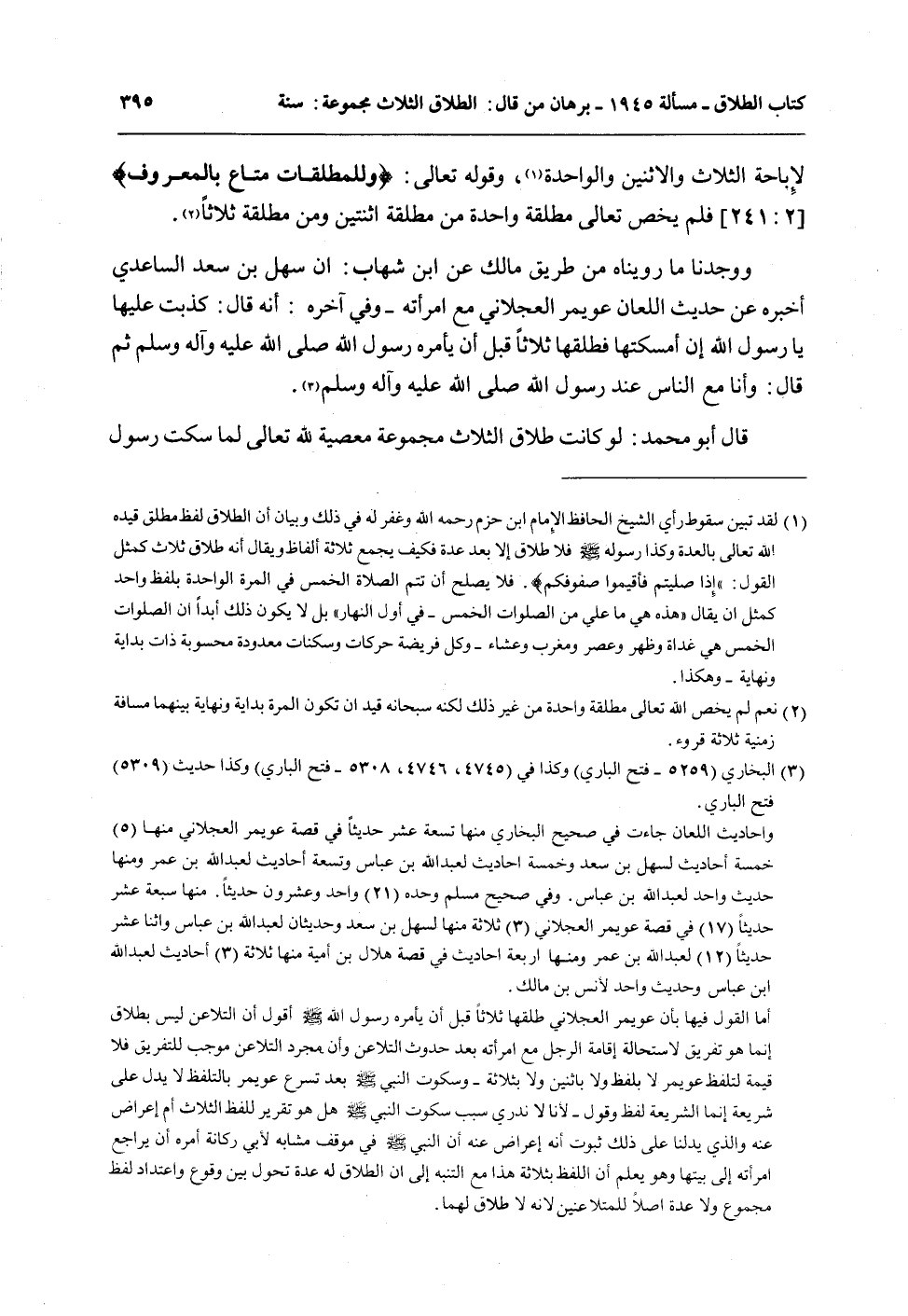 قَالَ أَبُو مُحَمَّدٍ: لَوْ كَانَ طَلَاقُ الثَّلَاثِ مَجْمُوعَةً مَعْصِيَةً لِلَّهِ تَعَالَى لَمَا سَكَتَ رَسُولُ
