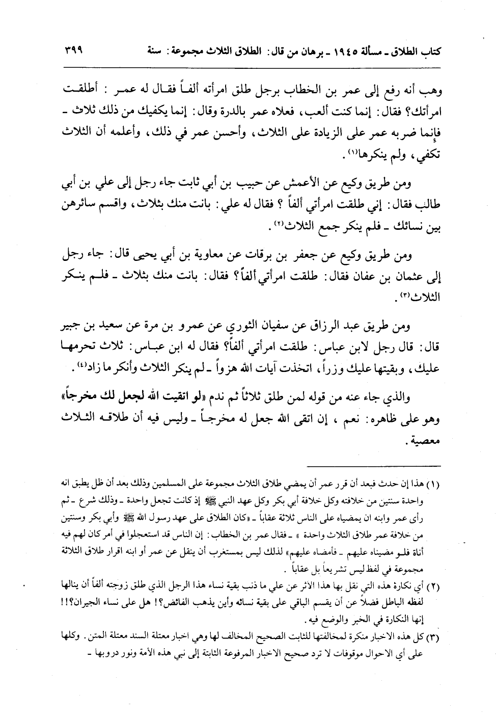 وَمِنْ طَرِيقِ عَبْدِ الرَّزَّاقِ عَنْ سُفْيَانَ الثَّوْرِيِّ عَنْ عَمْرِو بْنِ مُرَّةَ عَنْ سَعِيدِ بْنِ جُبَيْرٍ قَالَ: قَالَ رَجُلٌ لِابْنِ عَبَّاسٍ: طَلَّقْت امْرَأَتِي أَلْفًا؟ فَقَالَ لَهُ ابْنُ عَبَّاسٍ: ثَلَاثٌ تُحَرِّمُهَا عَلَيْك، وَبَقِيَّتُهَا عَلَيْك وِزْرًا، اتَّخَذْت آيَاتِ اللَّهِ هُزُوًا - لَمْ يُنْكِرْ الثَّلَاثَ وَأَنْكَرَ مَا زَادَ.