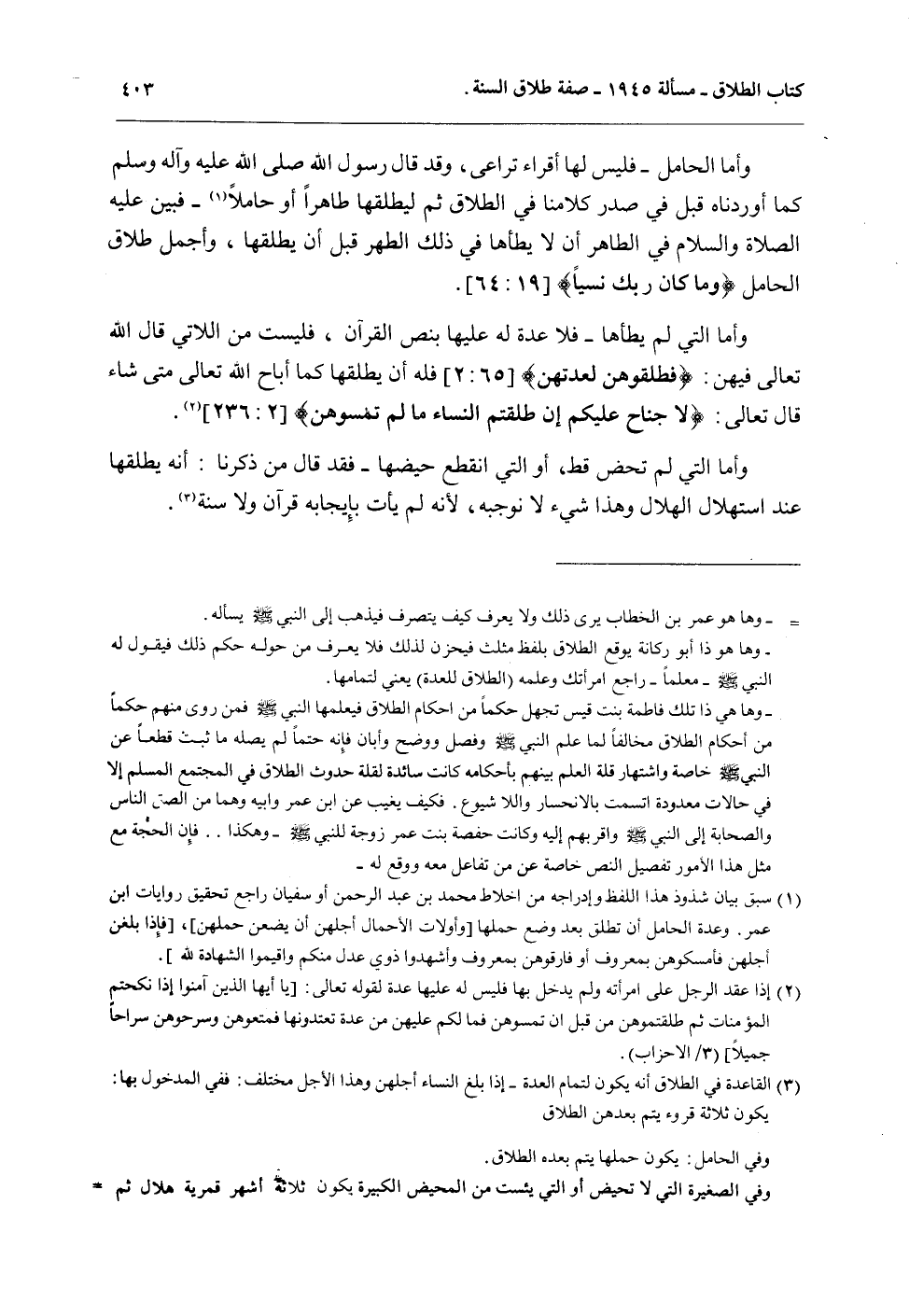 وَأَمَّا الْحَامِلُ - فَلَيْسَ لَهَا أَقْرَاءٌ تُرَاعَى، وَقَدْ قَالَ رَسُولُ اللَّهِ - صَلَّى اللَّهُ عَلَيْهِ وَآلِهِ وَسَلَّمَ - كَمَا أَوْرَدْنَاهُ قَبْلُ فِي صَدْرِ كَلَامِنَا فِي الطَّلَاقِ ثُمَّ لِيُطَلِّقْهَا طَاهِرًا أَوْ حَامِلًا - فَبَيَّنَ - عَلَيْهِ الصَّلَاةُ وَالسَّلَامُ - فِي الطَّاهِرِ أَنْ لَا يَطَأَهَا فِي ذَلِكَ الطُّهْرِ قَبْلَ أَنْ يُطَلِّقَهَا، وَأَجْمَلُ طَلَاقِ الْحَامِلِ {وَمَا كَانَ رَبُّكَ نَسِيًّا} [مريم: 64]