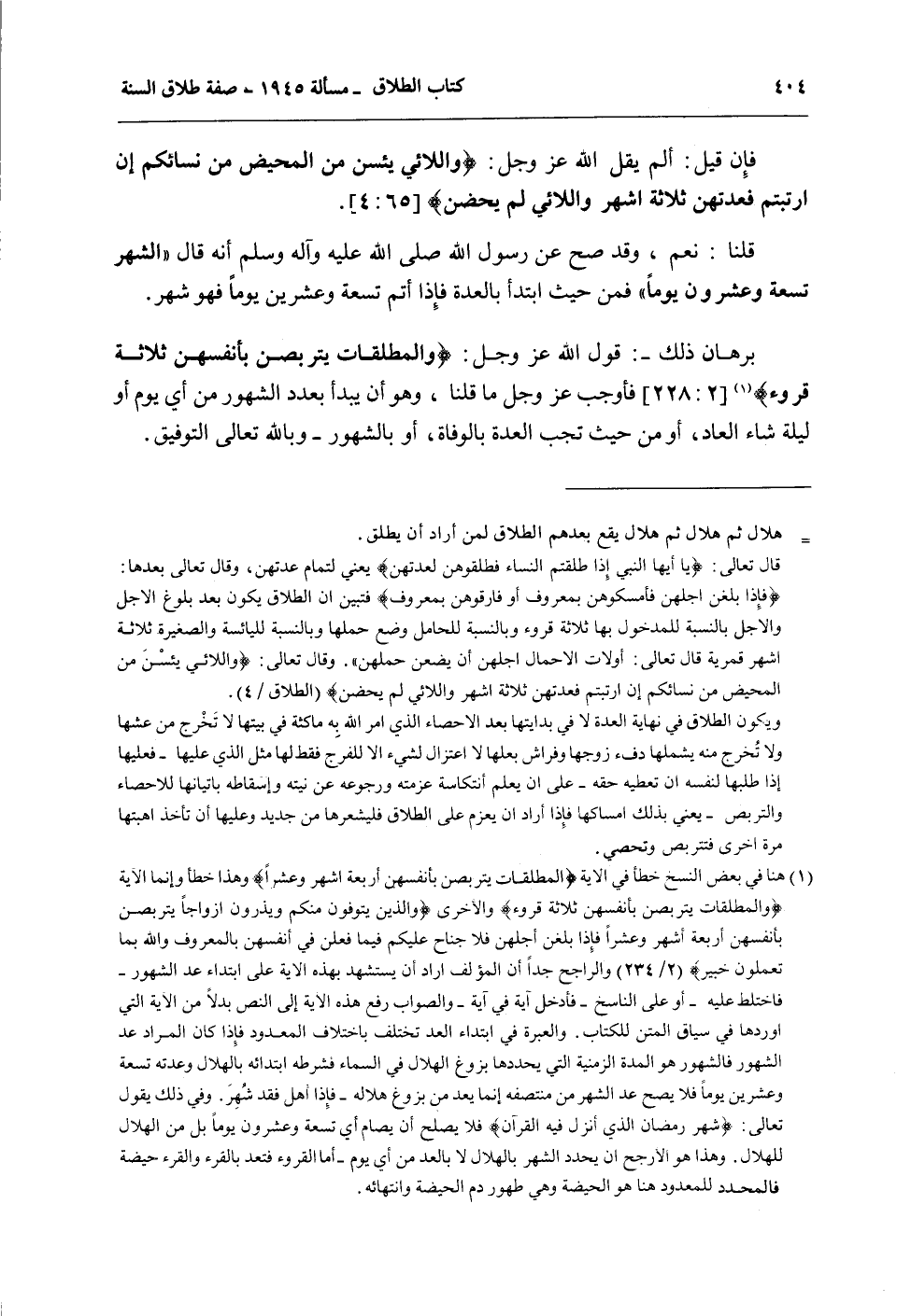 بُرْهَانُ ذَلِكَ: قَوْلُ اللَّهِ عَزَّ وَجَلَّ: {وَالْمُطَلَّقَاتُ يَتَرَبَّصْنَ بِأَنْفُسِهِنَّ ثَلاثَةَ قُرُوءٍ} [البقرة: 228] فَأَوْجَبَ عَزَّ وَجَلَّ مَا قُلْنَا، وَهُوَ أَنْ يَبْدَأَ بِعَدَدِ الشُّهُورِ مِنْ أَيِّ يَوْمٍ أَوْ لَيْلَةٍ شَاءَ الْعَادُّ، أَوْ مِنْ حَيْثُ تَجِبُ الْعِدَّةُ بِالْوَفَاةِ، أَوْ بِالشُّهُورِ - وَبِاَللَّهِ تَعَالَى التَّوْفِيقُ.