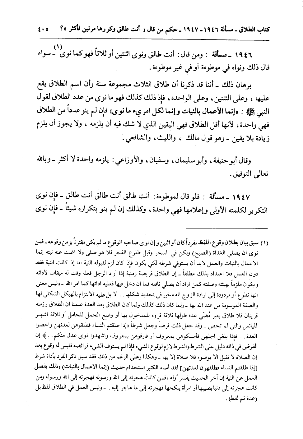 بُرْهَانُ ذَلِكَ - أَنَّنَا قَدْ ذَكَرْنَا أَنَّ طَلَاقَ الثَّلَاثِ مَجْمُوعَةً سُنَّةٌ وَأَنَّ اسْمَ الطَّلَاقِ يَقَعُ عَلَيْهَا، وَعَلَى الثِّنْتَيْنِ، وَعَلَى الْوَاحِدَةِ، فَإِذْ ذَلِكَ كَذَلِكَ فَهُوَ مَا نَوَى مِنْ عَدَدِ الطَّلَاقِ لِقَوْلِ النَّبِيِّ - صَلَّى اللَّهُ عَلَيْهِ وَسَلَّمَ -: «إنَّمَا الْأَعْمَالُ بِالنِّيَّاتِ وَإِنَّمَا لِكُلِّ امْرِئٍ مَا نَوَى» فَإِنْ لَمْ يَنْوِ عَدَدًا مِنْ الطَّلَاقِ فَهِيَ وَاحِدَةٌ، لِأَنَّهَا أَقَلُّ الطَّلَاقِ فَهِيَ الْيَقِينُ الَّذِي لَا شَكَّ فِيهِ أَنْ يَلْزَمَهُ، وَلَا يَجُوزُ أَنْ يَلْزَمَ زِيَادَةٌ بِلَا يَقِينٍ - وَهُوَ قَوْلُ مَالِكٍ، وَاللَّيْثِ، وَالشَّافِعِيِّ.