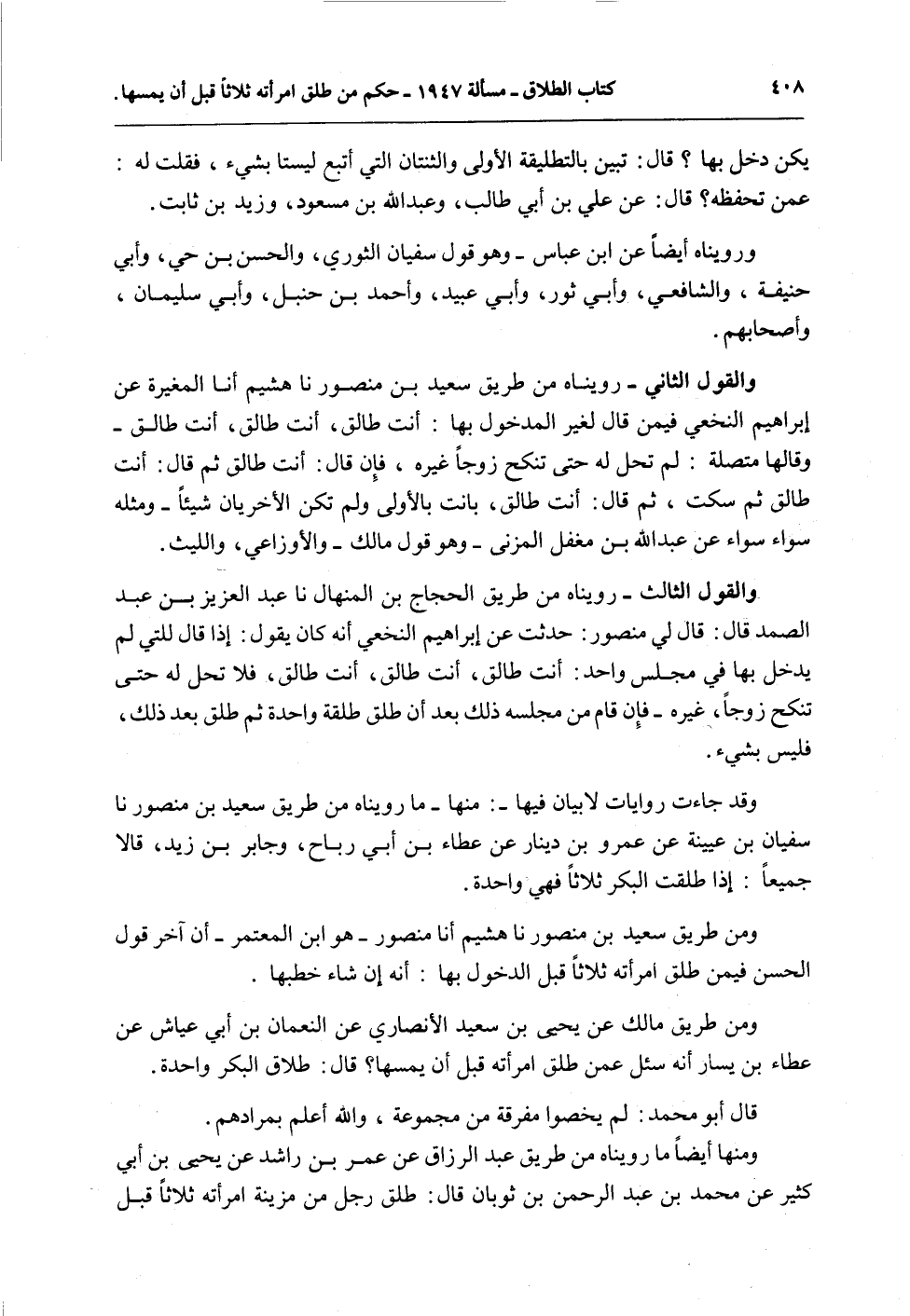 وَالْقَوْلُ الثَّالِثُ - رُوِّينَاهُ مِنْ طَرِيقِ الْحَجَّاجِ بْنِ الْمِنْهَالِ نا عَبْدُ الْعَزِيزِ بْنُ عَبْدِ الصَّمَدِ قَالَ: قَالَ لِي مَنْصُورٌ: حُدِّثْتُ عَنْ إبْرَاهِيمَ النَّخَعِيِّ أَنَّهُ كَانَ يَقُولُ: إذَا قَالَ لِلَّتِي لَمْ يَدْخُلْ بِهَا فِي مَجْلِسٍ وَاحِدٍ: أَنْتِ طَالِقٌ، أَنْتِ طَالِقٌ، أَنْتِ طَالِقٌ، فَلَا تَحِلُّ لَهُ حَتَّى تَنْكِحَ زَوْجًا، غَيْرَهُ - فَإِنْ قَامَ مِنْ مَجْلِسِهِ ذَلِكَ بَعْدَ أَنْ طَلَّقَ طَلْقَةً وَاحِدَةً ثُمَّ طَلَّقَ بَعْدَ ذَلِكَ، فَلَيْسَ بِشَيْءٍ.