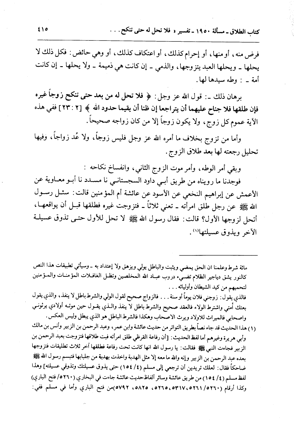 وَبَقِيَ أَمْرُ الْوَطْءِ، وَأَمْرُ مَوْتِ الزَّوْجِ الثَّانِي، وَانْفِسَاخُ نِكَاحِهِ: فَوَجَدْنَا مَا رُوِّينَاهُ مِنْ طَرِيقِ أَبِي دَاوُد السِّجِسْتَانِيِّ نَا مُسَدَّدٌ نا أَبُو مُعَاوِيَةَ عَنْ الْأَعْمَشِ عَنْ إبْرَاهِيمَ النَّخَعِيِّ عَنْ الْأَسْوَدِ عَنْ عَائِشَةَ أُمِّ الْمُؤْمِنِينَ قَالَتْ: «سُئِلَ رَسُولُ اللَّهِ - صَلَّى اللَّهُ عَلَيْهِ وَسَلَّمَ - عَنْ رَجُلٍ طَلَّقَ امْرَأَتَهُ - تَعْنِي ثَلَاثًا - فَتَزَوَّجَتْ غَيْرَهُ فَطَلَّقَهَا قَبْلَ أَنْ يُوَاقِعَهَا، أَتَحِلُّ لِزَوْجِهَا الْأَوَّلِ؟ قَالَتْ: فَقَالَ رَسُولُ اللَّهِ - صَلَّى اللَّهُ عَلَيْهِ وَسَلَّمَ -: لَا تَحِلُّ لِلْأَوَّلِ حَتَّى تَذُوقَ عُسَيْلَةَ الْآخَرِ وَيَذُوقَ عُسَيْلَتَهَا» .