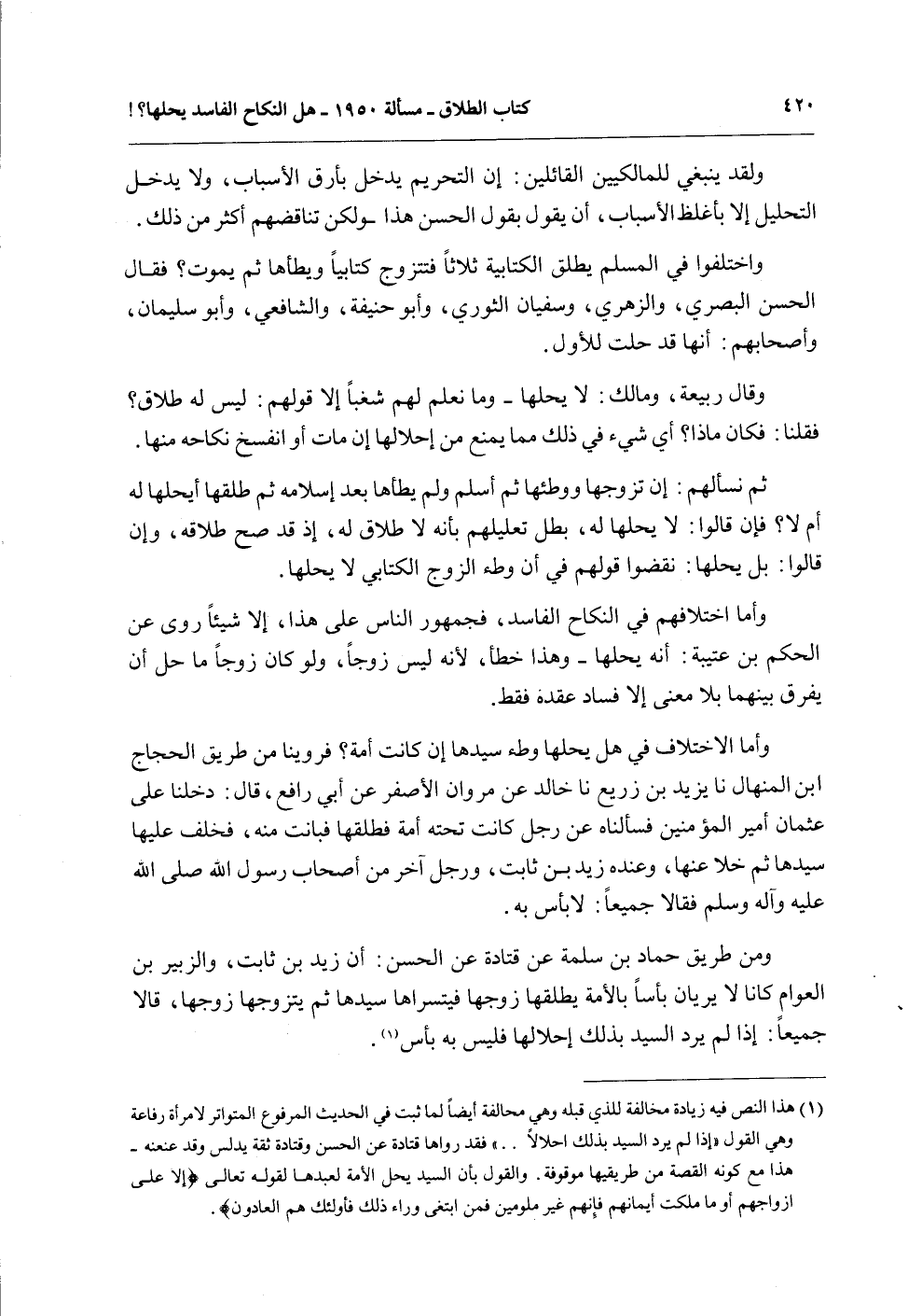 ثُمَّ نَسْأَلُهُمْ: إنْ تَزَوَّجَهَا وَوَطِئَهَا ثُمَّ أَسْلَمَ وَلَمْ يَطَأْهَا بَعْدَ إسْلَامِهِ ثُمَّ طَلَّقَهَا أَيُحِلُّهَا لَهُ أَمْ لَا؟ فَإِنْ قَالُوا: لَا يُحِلُّهَا لَهُ، بَطَلَ تَعْلِيلُهُمْ بِأَنَّهُ لَا طَلَاقَ لَهُ، إذْ قَدْ صَحَّ طَلَاقُهُ، وَإِنْ قَالُوا: بَلْ يُحِلُّهَا: نَقَضُوا قَوْلَهُمْ فِي أَنَّ وَطْءَ الزَّوْجِ الْكِتَابِيِّ لَا يُحِلُّهَا.