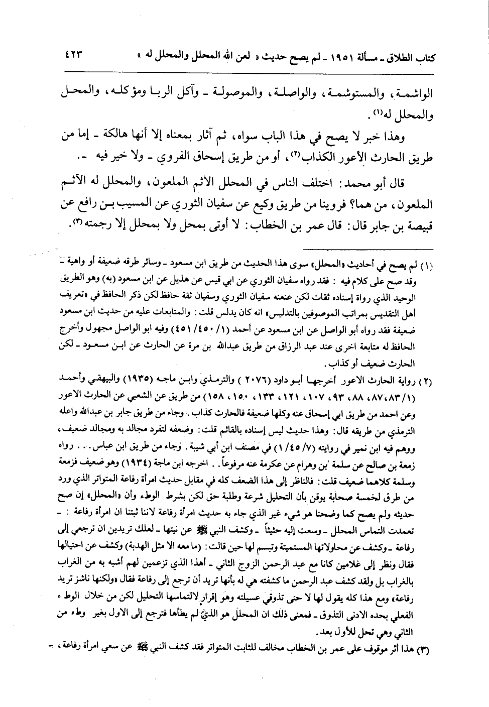 قَالَ أَبُو مُحَمَّدٍ: اخْتَلَفَ النَّاسُ فِي الْمُحَلِّلِ الْآثِمِ الْمَلْعُونِ، وَالْمُحَلَّلِ لَهُ الْآثِمِ الْمَلْعُونِ، مَنْ هُمَا؟ فَرُوِّينَا مِنْ طَرِيقِ وَكِيعٍ عَنْ سُفْيَانَ الثَّوْرِيِّ عَنْ الْمُسَيِّبِ بْنِ رَافِعٍ عَنْ قَبِيصَةَ بْنِ جَابِرٍ قَالَ: قَالَ عُمَرُ بْنُ الْخَطَّابِ: لَا أُوتَى بِمُحِلٍّ وَلَا بِمُحَلَّلٍ إلَّا رَجَمْته.