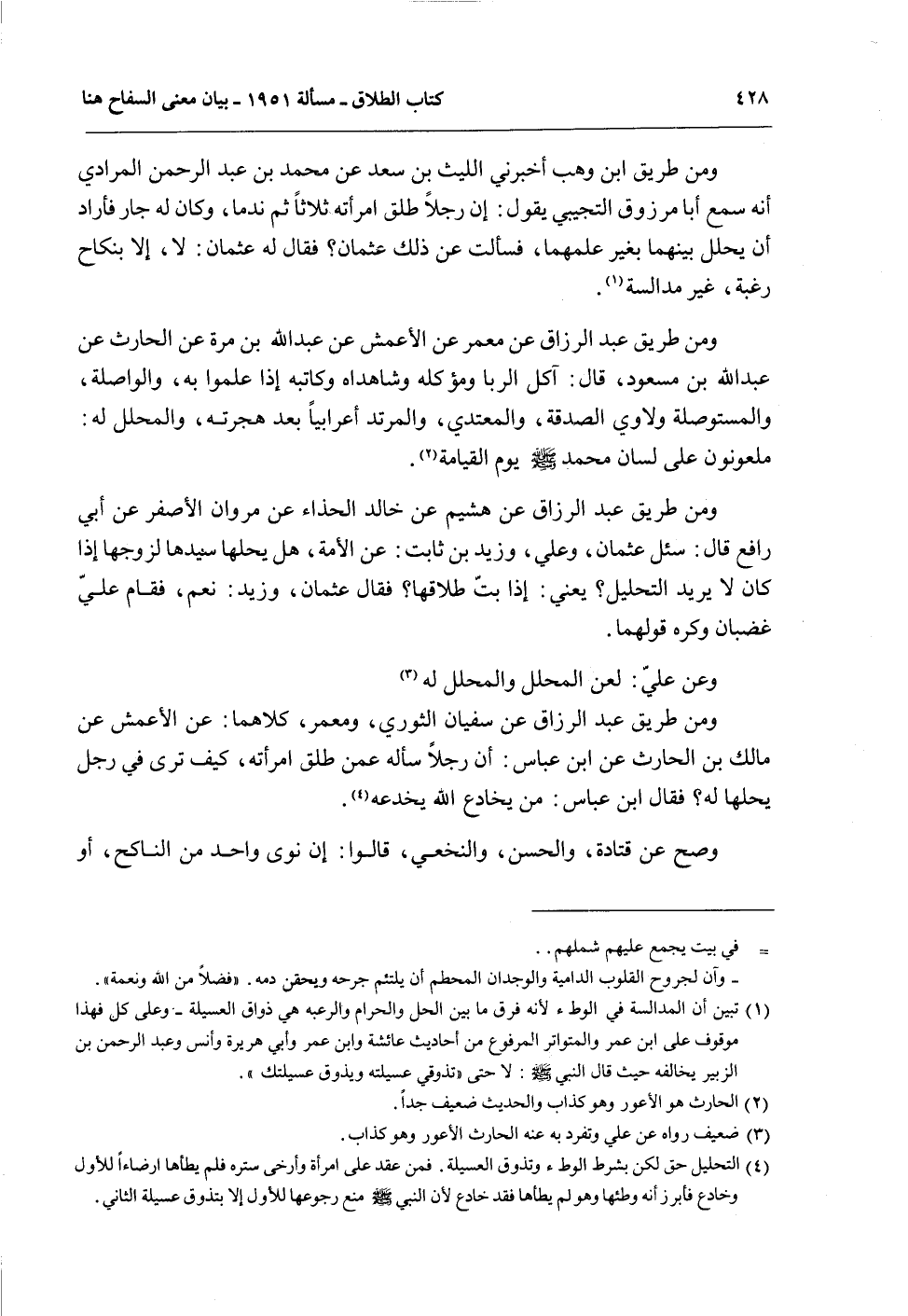وَمِنْ طَرِيقِ عَبْدِ الرَّزَّاقِ عَنْ سُفْيَانَ الثَّوْرِيِّ، وَمَعْمَرٍ، كِلَاهُمَا: عَنْ الْأَعْمَشِ عَنْ مَالِكِ بْنِ الْحَارِثِ عَنْ ابْنِ عَبَّاسٍ: أَنَّ رَجُلًا سَأَلَ عَمَّنْ طَلَّقَ امْرَأَتَهُ، كَيْفَ تَرَى فِي رَجُلٍ يُحِلُّهَا لَهُ؟ فَقَالَ ابْنُ عَبَّاسٍ: مَنْ يُخَادِعْ اللَّهَ يَخْدَعْهُ.