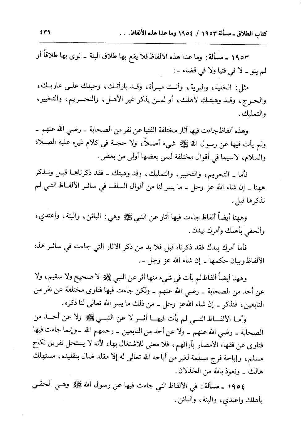 1954 - مَسْأَلَةٌ: فِي الْأَلْفَاظِ الَّتِي جَاءَتْ فِيهَا عَنْ رَسُولِ اللَّهِ - صَلَّى اللَّهُ عَلَيْهِ وَسَلَّمَ - وَهِيَ الْحَقِي بِأَهْلِك وَاعْتَدِّي، وَأَلْبَتَّةَ، وَالْبَائِنُ