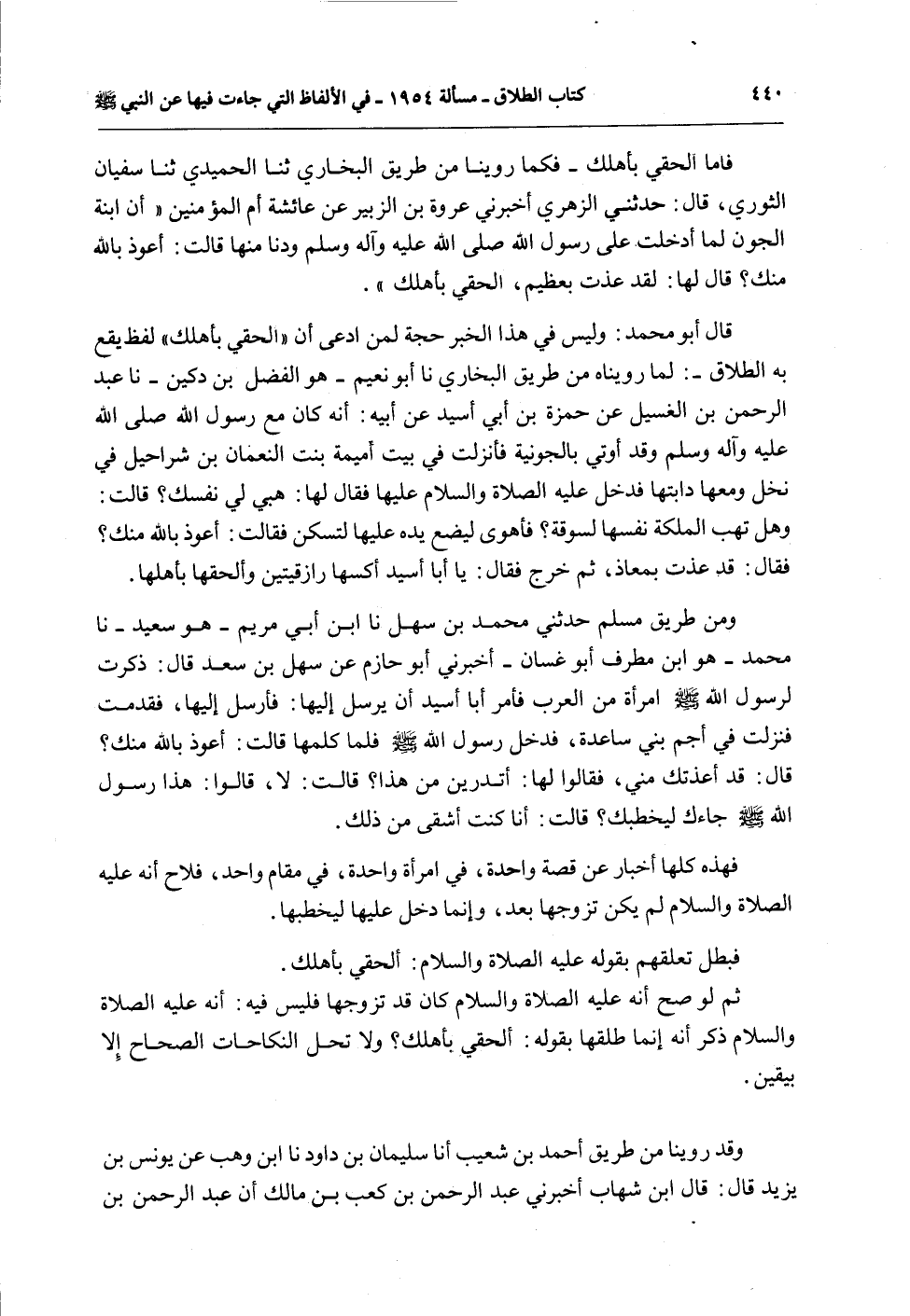 قَالَ أَبُو مُحَمَّدٍ: وَلَيْسَ فِي هَذَا الْخَبَرِ حُجَّةٌ لِمَنْ ادَّعَى أَنَّ " الْحَقِي بِأَهْلِك " لَفْظٌ يَقَعُ بِهِ الطَّلَاقُ -: لِمَا رُوِّينَاهُ مِنْ طَرِيقِ الْبُخَارِيِّ نا أَبُو نُعَيْمٍ - هُوَ الْفَضْلُ بْنُ دُكَيْنٍ - نا عَبْدُ الرَّحْمَنِ بْنُ الْغَسِيلِ عَنْ حَمْزَةَ بْنِ أَبِي أُسَيْدَ عَنْ أَبِيهِ: «أَنَّهُ كَانَ مَعَ رَسُولِ اللَّهِ - صَلَّى اللَّهُ عَلَيْهِ وَآلِهِ وَسَلَّمَ - وَقَدْ أُوتِيَ بِالْجُونِيَّةِ فَأُنْزِلَتْ فِي بَيْتِ أُمَيْمَةَ بِنْتِ النُّعْمَانِ بْنِ شَرَاحِيلَ فِي نَخْلٍ وَمَعَهَا دَابَّتُهَا فَدَخَلَ - عَلَيْهِ الصَّلَاةُ وَالسَّلَامُ - عَلَيْهَا فَقَالَ لَهَا: هَبِي لِي نَفْسَكِ؟ قَالَتْ: وَهَلْ تَهَبُ الْمَلِكَةُ نَفْسَهَا لِسُوقَةٍ؟ فَأَهْوَى لِيَضَعَ يَدَهُ عَلَيْهَا لِتَسْكُنَ فَقَالَتْ: أَعُوذُ بِاَللَّهِ مِنْكَ، فَقَالَ: قَدْ عُذْتِ بِمَعَاذٍ، ثُمَّ خَرَجَ فَقَالَ: يَا أَبَا أُسَيْدَ اُكْسُهَا رَازِقِيَّتَيْنِ وَأَلْحِقْهَا بِأَهْلِهَا» .
