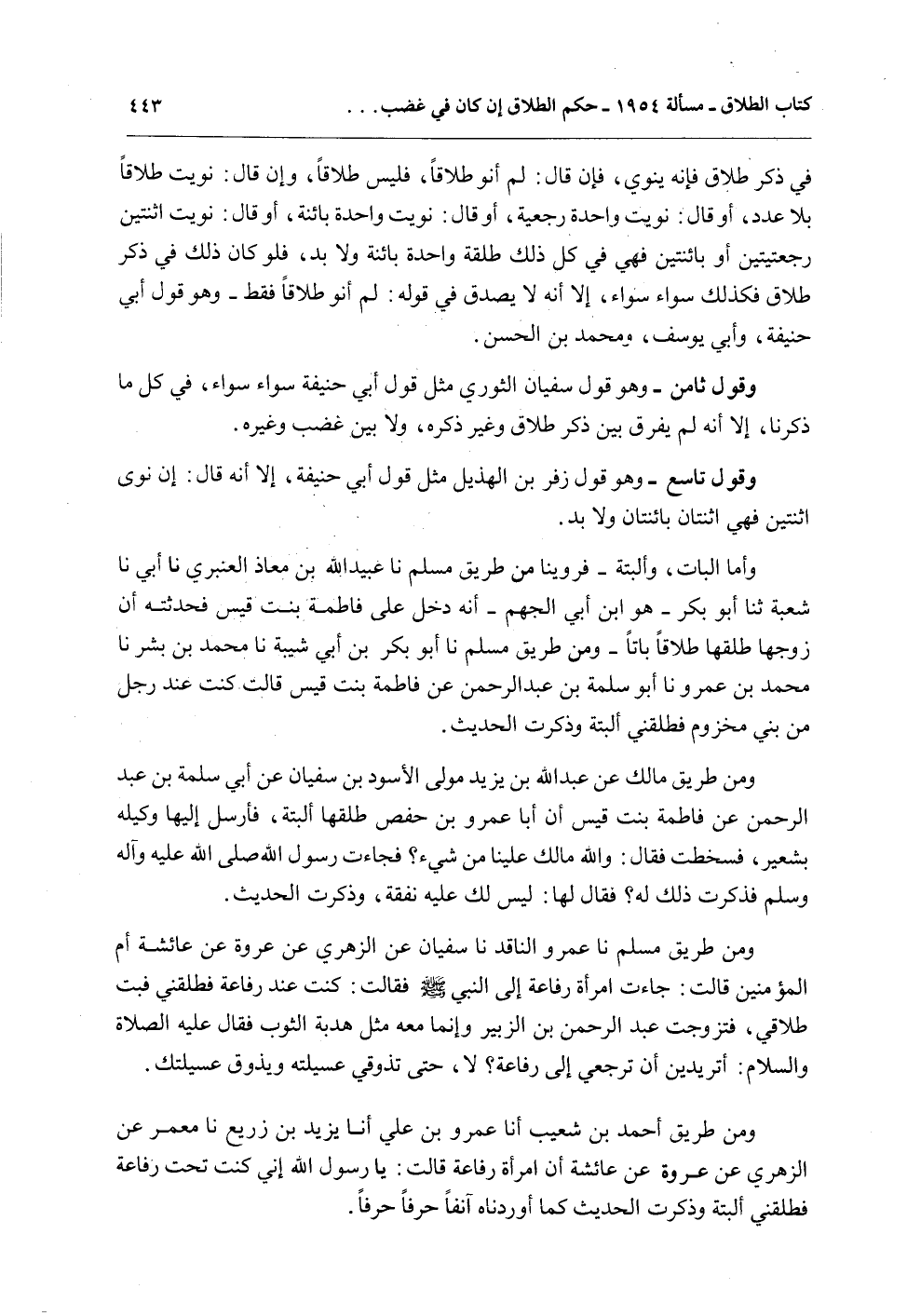 وَمِنْ طَرِيقِ مُسْلِمٍ نا عَمْرُو النَّاقِدُ نا سُفْيَانُ عَنْ الزُّهْرِيِّ عَنْ عُرْوَةَ عَنْ عَائِشَةَ أُمِّ الْمُؤْمِنِينَ قَالَتْ: «جَاءَتْ امْرَأَةُ رِفَاعَةَ إلَى النَّبِيِّ - صَلَّى اللَّهُ عَلَيْهِ وَسَلَّمَ - فَقَالَتْ كُنْتُ عِنْدَ رِفَاعَةَ فَطَلَّقَنِي فَبَتَّ طَلَاقِي، فَتَزَوَّجْتُ عَبْدَ الرَّحْمَنِ بْنَ الزُّبَيْرِ وَإِنَّمَا مَعَهُ مِثْلُ هُدْبَةِ الثَّوْبِ فَقَالَ - عَلَيْهِ الصَّلَاةُ وَالسَّلَامُ -: أَتُرِيدِينَ أَنْ تَرْجِعِي إلَى رِفَاعَةَ؟ لَا، حَتَّى تَذُوقِي عُسَيْلَتَهُ وَيَذُوقَ عُسَيْلَتَكِ» .