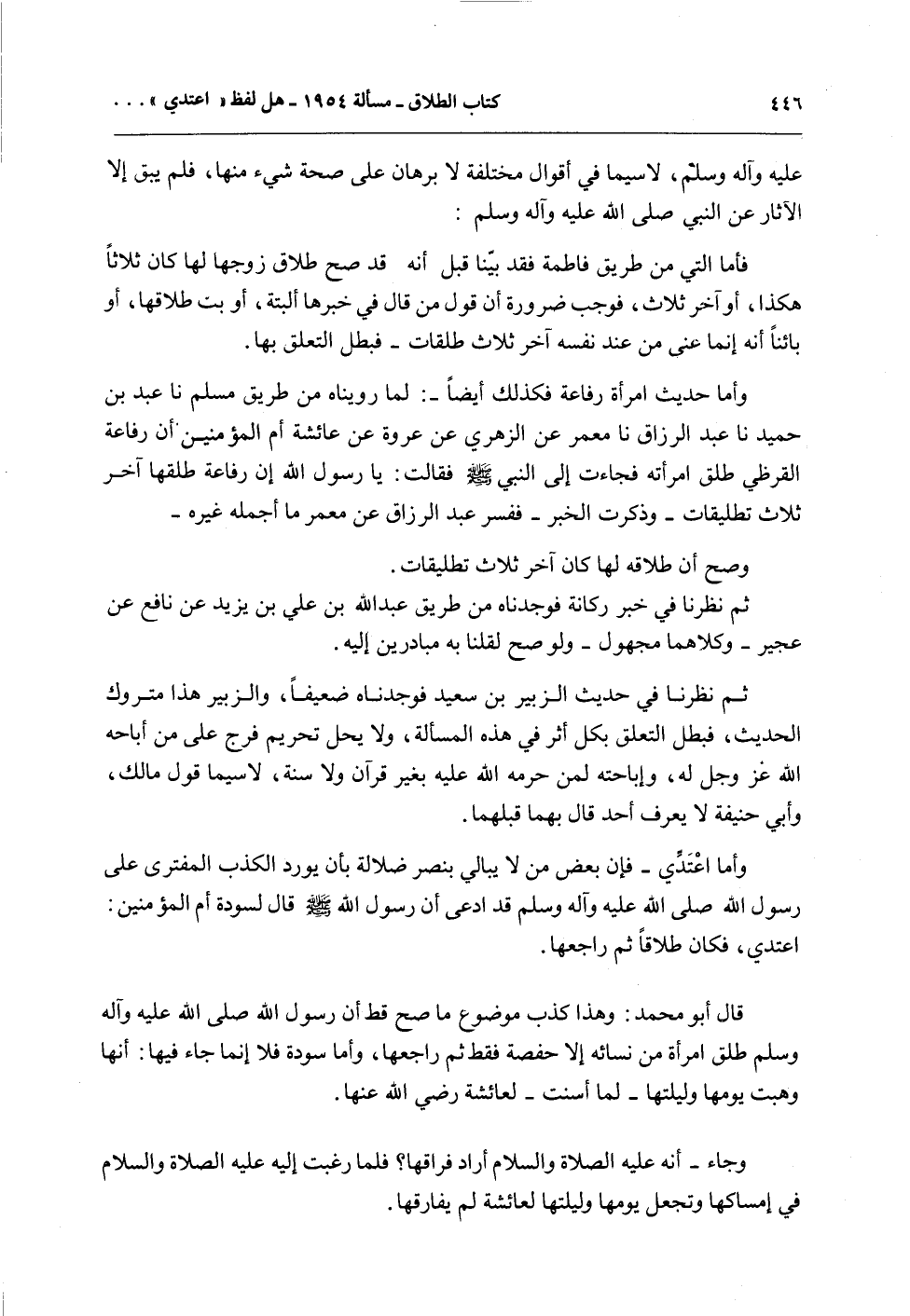 قَالَ أَبُو مُحَمَّدٍ: وَهَذَا كَذِبٌ مَوْضُوعٌ مَا صَحَّ قَطُّ أَنَّ رَسُولَ اللَّهِ - صَلَّى اللَّهُ عَلَيْهِ وَآلِهِ وَسَلَّمَ - طَلَّقَ امْرَأَةً مِنْ نِسَائِهِ إلَّا حَفْصَةَ فَقَطْ ثُمَّ رَاجَعَهَا، وَأَمَّا سَوْدَةُ فَلَا إنَّمَا جَاءَ فِيهَا: أَنَّهَا وَهَبَتْ يَوْمَهَا وَلَيْلَتَهَا - لَمَّا أَسَنَّتْ - لِعَائِشَةَ - رَضِيَ اللَّهُ عَنْهَا -.