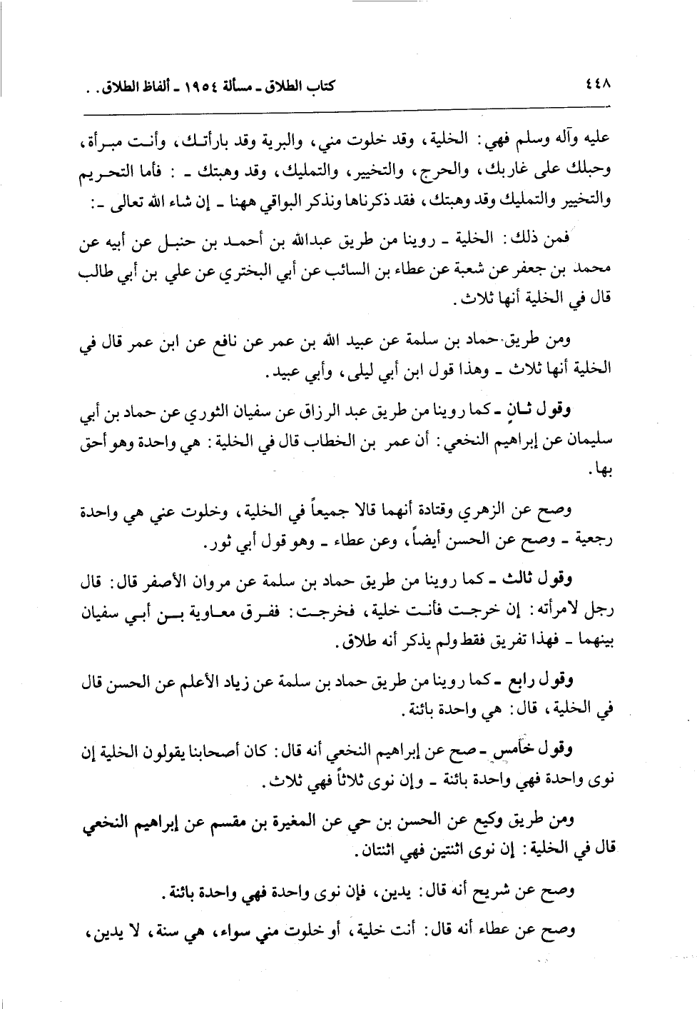 وَمِنْ طَرِيقِ حَمَّادِ بْنِ سَلَمَةَ عَنْ عُبَيْدِ اللَّهِ بْنِ عُمَرَ عَنْ نَافِعٍ عَنْ ابْنِ عُمَرَ قَالَ فِي الْخَلِيَّةِ: إنَّهَا ثَلَاثٌ - وَهَذَا قَوْلُ ابْنِ أَبِي لَيْلَى، وَأَبِي عُبَيْدٍ. وَقَوْلٌ ثَانٍ - كَمَا رُوِّينَا مِنْ طَرِيقِ عَبْدِ الرَّزَّاقِ عَنْ سُفْيَانَ الثَّوْرِيِّ عَنْ حَمَّادِ بْنِ أَبِي سُلَيْمَانَ عَنْ إبْرَاهِيمَ النَّخَعِيِّ: أَنَّ عُمَرَ بْنَ الْخَطَّابِ قَالَ فِي الْخَلِيَّةِ: هِيَ وَاحِدَةٌ وَهُوَ أَحَقُّ بِهَا.