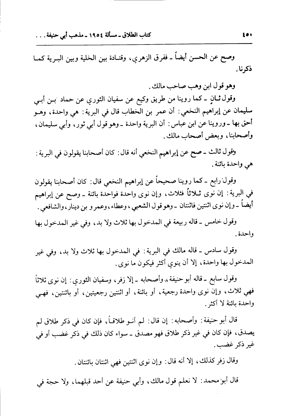 وَقَوْلٌ ثَالِثٌ - صَحَّ عَنْ إبْرَاهِيمَ النَّخَعِيِّ أَنَّهُ قَالَ: كَانَ أَصْحَابُنَا يَقُولُونَ فِي الْبَرِيَّةِ: هِيَ وَاحِدَةٌ بَائِنَةٌ.