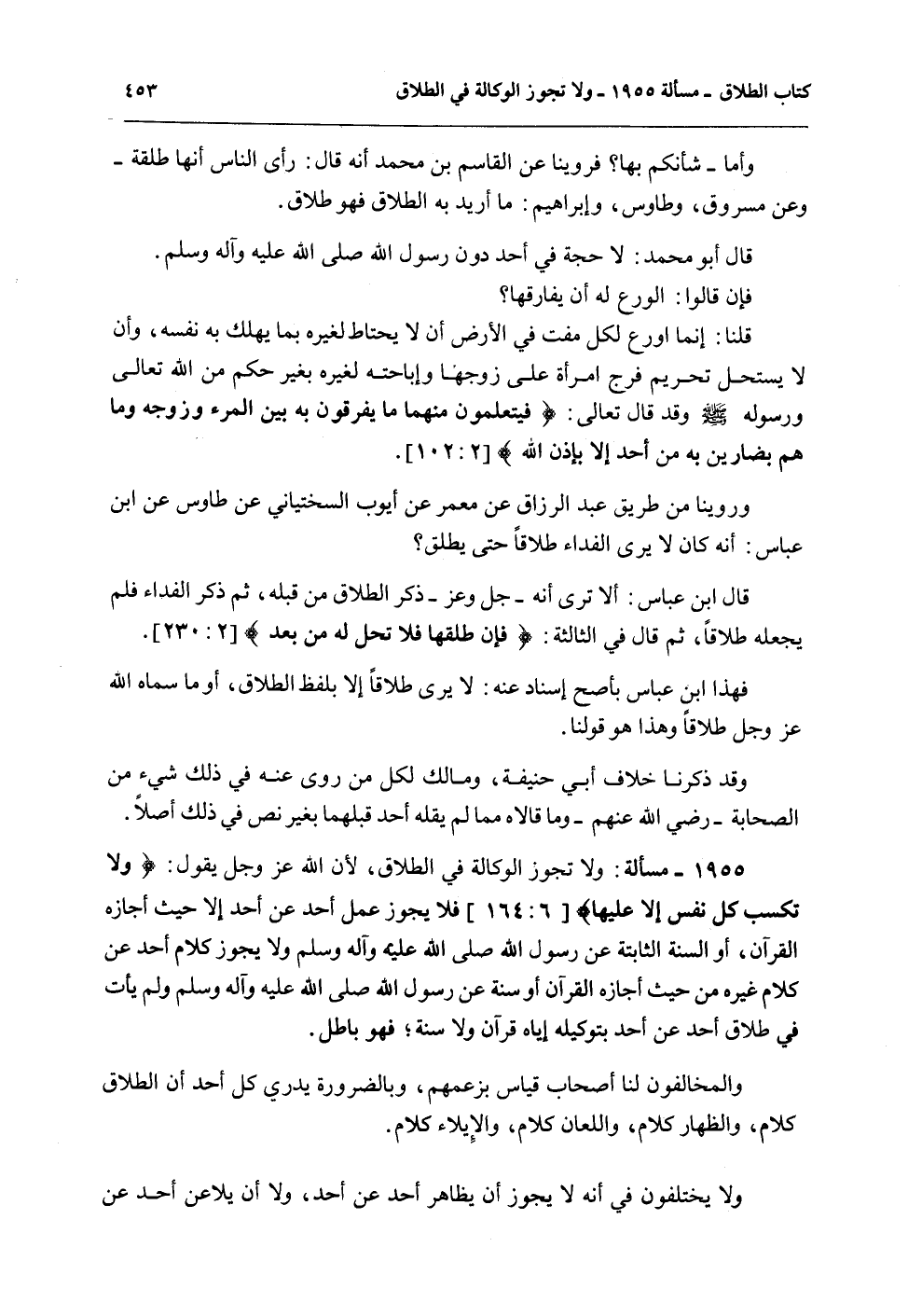 1955 - مَسْأَلَةٌ: وَلَا تَجُوزُ الْوَكَالَةُ فِي الطَّلَاقِ، لِأَنَّ اللَّهَ عَزَّ وَجَلَّ يَقُولُ: {وَلا تَكْسِبُ كُلُّ نَفْسٍ إِلا عَلَيْهَا} [الأنعام: 164] فَلَا يَجُوزُ عَمَلُ أَحَدٍ عَنْ أَحَدٍ إلَّا حَيْثُ أَجَازَهُ الْقُرْآنُ، أَوْ السُّنَّةُ الثَّابِتَةُ عَنْ رَسُولِ اللَّهِ - صَلَّى اللَّهُ عَلَيْهِ وَآلِهِ وَسَلَّمَ - وَلَا يَجُوزُ كَلَامُ أَحَدٍ عَنْ كَلَامِ غَيْرِهِ مِنْ حَيْثُ أَجَازَهُ الْقُرْآنُ أَوْ سُنَّةٌ عَنْ رَسُولِ اللَّهِ - صَلَّى اللَّهُ عَلَيْهِ وَآلِهِ وَسَلَّمَ - وَلَمْ يَأْتِ فِي طَلَاقِ أَحَدٍ عَنْ أَحَدٍ بِتَوْكِيلِهِ إيَّاهُ قُرْآنٌ وَلَا سُنَّةٌ؛ فَهُوَ بَاطِلٌ.