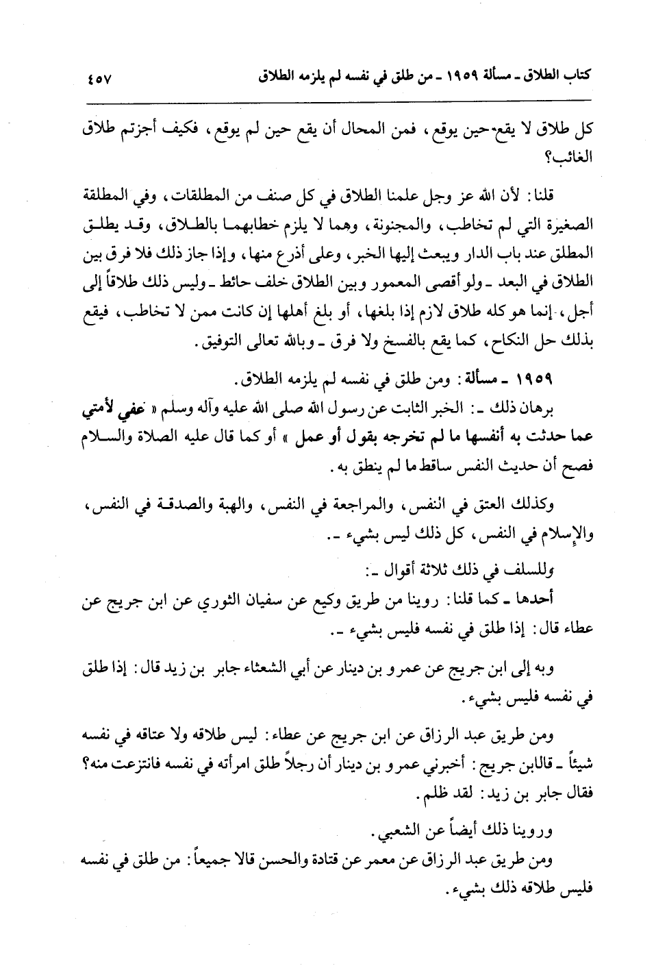 1959 - مَسْأَلَةٌ: وَمَنْ طَلَّقَ فِي نَفْسِهِ لَمْ يَلْزَمْهُ الطَّلَاقُ.