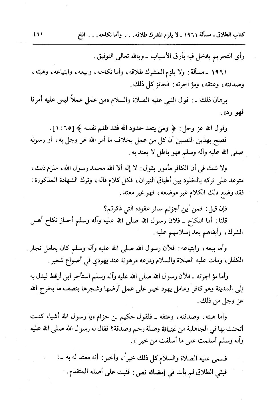 1961 - مَسْأَلَةٌ: وَلَا يَلْزَمُ الْمُشْرِكَ طَلَاقُهُ، وَأَمَّا نِكَاحُهُ، وَبَيْعُهُ، وَابْتِيَاعُهُ، وَهِبَتُهُ، وَصَدَقَتُهُ، وَعِتْقُهُ، وَمُؤَاجَرَتُهُ: فَجَائِزٌ كُلُّ ذَلِكَ.