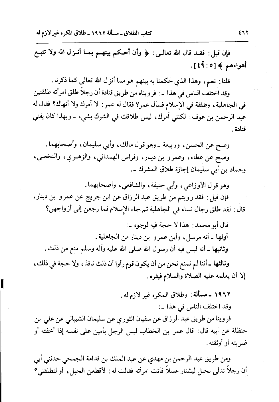1962 - مَسْأَلَةٌ: وَطَلَاقُ الْمُكْرَهِ غَيْرُ لَازِمٍ لَهُ.