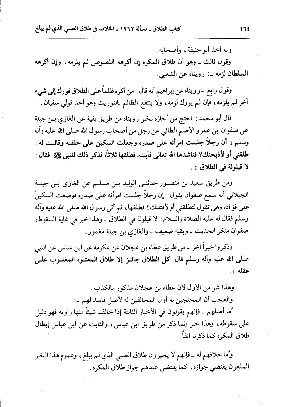 وَأَمَّا خِلَافُهُمْ لَهُ - فَإِنَّهُمْ لَا يُجِيزُونَ طَلَاقَ الصَّبِيِّ الَّذِي لَمْ يَبْلُغْ، وَعُمُومُ هَذَا الْخَبَرِ الْمَلْعُونِ يَقْتَضِي جَوَازَهُ، كَمَا يَقْتَضِي عِنْدَهُمْ جَوَازَ طَلَاقِ الْمُكْرَهِ.