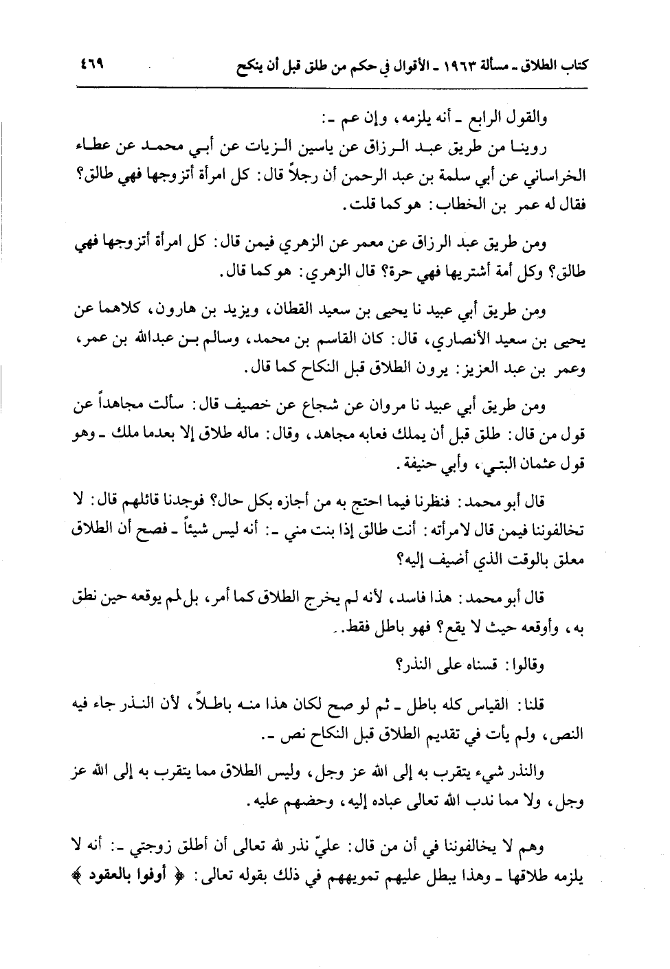 وَمِنْ طَرِيقِ أَبِي عُبَيْدٍ نا مَرْوَانُ عَنْ شُجَاعٍ عَنْ خُصَيْفٍ قَالَ: سَأَلْت مُجَاهِدًا عَنْ قَوْلِ مَنْ قَالَ: طَلَّقَ قَبْلَ أَنْ يَمْلِكَ فَعَابَهُ مُجَاهِدٌ، وَقَالَ: مَا لَهُ طَلَاقٌ إلَّا بَعْدَمَا مَلَكَ - وَهُوَ قَوْلُ عُثْمَانَ الْبَتِّيِّ، وَأَبِي حَنِيفَةَ. قَالَ أَبُو مُحَمَّدٍ: فَنَظَرْنَا فِيمَا احْتَجَّ بِهِ مَنْ أَجَازَهُ بِكُلِّ حَالٍ؟ فَوَجَدْنَا قَائِلَهُمْ قَالَ: لَا تُخَالِفُونَنَا فِيمَنْ قَالَ لِامْرَأَتِهِ: أَنْتِ طَالِقٌ إذَا بِنْت مِنِّي -: أَنَّهُ لَيْسَ شَيْئًا - فَصَحَّ أَنَّ الطَّلَاقَ مُعَلَّقٌ بِالْوَقْتِ الَّذِي أُضِيفَ إلَيْهِ؟ قَالَ أَبُو مُحَمَّدٍ: هَذَا فَاسِدٌ، لِأَنَّهُ لَمْ يُخْرِجْ الطَّلَاقَ كَمَا أَمَرَ، بَلْ لَمْ يُوقِعْهُ حِينَ نَطَقَ بِهِ، وَأَوْقَعَهُ حَيْثُ لَا يَقَعُ؟ فَهُوَ بَاطِلٌ فَقَطْ.
