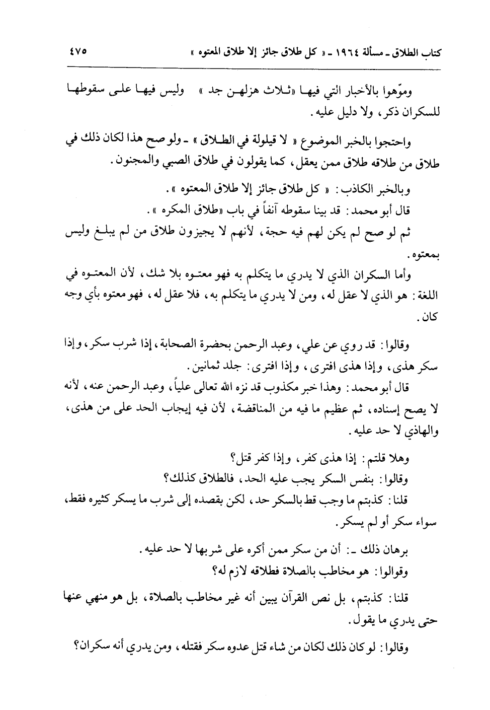 وَقَالُوا: لَوْ كَانَ ذَلِكَ لَكَانَ مَنْ شَاءَ قَتْلَ عَدُوِّهِ سَكِرَ فَقَتَلَهُ، وَمَنْ يَدْرِي أَنَّهُ سَكْرَانُ؟
