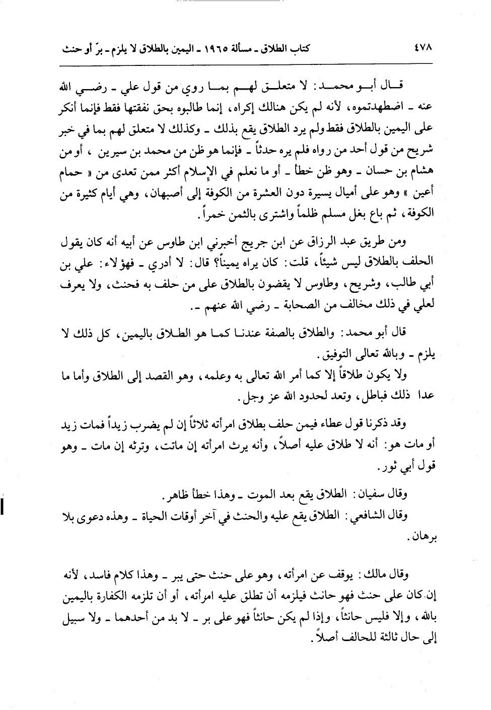 وَمِنْ طَرِيقِ عَبْدِ الرَّزَّاقِ عَنْ ابْنِ جُرَيْجٍ أَخْبَرَنِي ابْنُ طَاوُسٍ عَنْ أَبِيهِ أَنَّهُ كَانَ يَقُولُ: الْحَلِفُ بِالطَّلَاقِ لَيْسَ شَيْئًا، قُلْت: كَانَ يَرَاهُ يَمِينًا؟ قَالَ: لَا أَدْرِي - فَهَؤُلَاءِ: عَلِيُّ بْنُ أَبِي طَالِبٍ، وَشُرَيْحٌ، وَطَاوُسٌ لَا يَقْضُونَ بِالطَّلَاقِ عَلَى مَنْ حَلَفَ بِهِ فَحَنِثَ، وَلَا يُعْرَفُ لِعَلِيٍّ فِي ذَلِكَ مُخَالِفٌ مِنْ الصَّحَابَةِ - رَضِيَ اللَّهُ عَنْهُمْ -.