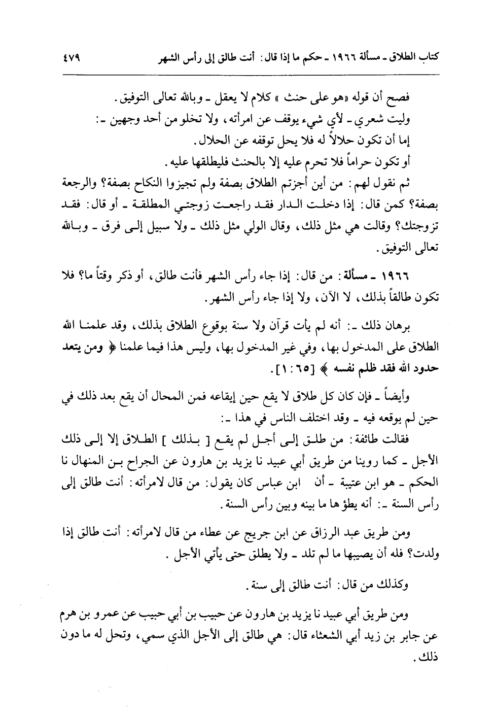 وَأَيْضًا - فَإِنْ كَانَ كُلُّ طَلَاقٍ لَا يَقَعُ حِينَ إيقَاعِهِ فَمِنْ الْمُحَالِ أَنْ يَقَعَ بَعْدَ ذَلِكَ فِي حِينِ لَمْ يُوقِعْهُ فِيهِ - وَقَدْ اخْتَلَفَ النَّاسُ فِي هَذَا -: فَقَالَتْ طَائِفَةٌ: مَنْ طَلَّقَ إلَى أَجَلٍ لَمْ يَقَعْ الطَّلَاقُ إلَّا إلَى ذَلِكَ الْأَجَلِ - كَمَا رُوِّينَا مِنْ طَرِيقِ أَبِي عُبَيْدٍ نا يَزِيدُ بْنُ هَارُونَ عَنْ الْجَرَّاحِ بْنِ الْمِنْهَالِ نَا الْحَكَمُ - هُوَ ابْنُ عُتَيْبَةَ - أَنَّ ابْنَ عَبَّاسٍ كَانَ يَقُولُ: مَنْ قَالَ لِامْرَأَتِهِ: أَنْتِ طَالِقٌ إلَى رَأْسِ السَّنَةِ -: أَنَّهُ يَطَؤُهَا مَا بَيْنَهُ وَبَيْنَ رَأْسِ السَّنَةِ.